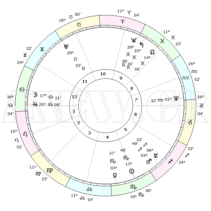 | | ΘΕΣΕΙΣ ΠΛΑΝΗΤΩΝ ΑΣΤΡΟΛΟΓΙΚΟΥ ΧΑΡΤΗ ΤΗΣ ΣΤΙΓΜΗΣ ΑΥΤΗΣ | | | | Πλανήτης | Ζώδιο | Μοίρες | Δεκαήμ. | Σε οίκο | Απόκλιση | | Ακμές των οίκων | | Ηλιος | Σκορπιός | 17°33' | Δεύτερο | 6 | 17 S 04 | | 1ος | 19°21' | Δίδυμοι | | Σελήνη | Καρκίνος | 15°43' | Δεύτερο | 2 | 26 N 54 | | 2ος | 11°04' | Καρκίνος | | Ερμής | Τοξότης | 06°52' | Πρώτο | 6 | 23 S 47 | | 3ος | 02°22' | Λέων | | Αφροδίτη | Σκορπιός | 03°29' | Πρώτο | 5 | 11 S 25 | | 4ος | 27°08' | Λέων | | Αρης | Τοξότης | 03°44' | Πρώτο | 6 | 21 S 21 | | 5ος | 29°11' | Παρθένος | | Δίας | Καρκίνος | 25°09' | Τρίτο | 2 | 21 N 12 | | 6ος | 09°28' | Σκορπιός | | Κρόνος | Ιχθείς | 25°35'R | Τρίτο | 10 | 04 S 00 | | 7ος | 19°21' | Τοξότης | | Ουρανός | Ταύρος | 29°56'R | Τρίτο | 12 | 19 N 56 | | 8ος | 11°04' | Αιγόκερως | | Ποσειδώνας | Ιχθείς | 29°38'R | Τρίτο | 11 | 01 S 24 | | 9ος | 02°22' | Υδροχόος | | Πλούτωνας | Υδροχόος | 01°32' | Πρώτο | 8 | 23 S 29 | | 10ος | 27°08' | Υδροχόος | | Β. Δεσμός | Ιχθείς | 14°56' | Δεύτερο | 10 | 05 S 56 | | 11ος | 29°11' | Ιχθείς | | Ωροσκόπος | Δίδυμοι | 19°21' | Δεύτερο | | | 12ος | 09°28' | Ταύρος | | Μεσουράνημα | Υδροχόος | 27°08' | Τρίτο | | | |