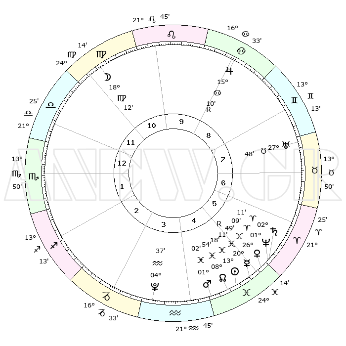 | | ΘΕΣΕΙΣ ΠΛΑΝΗΤΩΝ ΑΣΤΡΟΛΟΓΙΚΟΥ ΧΑΡΤΗ ΤΗΣ ΣΤΙΓΜΗΣ ΑΥΤΗΣ | | | | Πλανήτης | Ζώδιο | Μοίρες | Δεκαήμ. | Σε οίκο | Απόκλιση | | Ακμές των οίκων | | Ηλιος | Ιχθείς | 13°14' | Δεύτερο | 5 | 06 S 35 | | 1ος | 24°04' | Ζυγός | | Σελήνη | Παρθένος | 17°18' | Δεύτερο | 11 | 04 N 18 | | 2ος | 22°08' | Σκορπιός | | Ερμής | Ιχθείς | 20°14'R | Τρίτο | 5 | 00 S 32 | | 3ος | 23°40' | Τοξότης | | Αφροδίτη | Ιχθείς | 26°44' | Τρίτο | 5 | 02 S 30 | | 4ος | 27°29' | Αιγόκερως | | Αρης | Ιχθείς | 00°58' | Πρώτο | 5 | 12 S 09 | | 5ος | 00°26' | Ιχθείς | | Δίας | Καρκίνος | 15°10'R | Δεύτερο | 9 | 22 N 55 | | 6ος | 29°36' | Ιχθείς | | Κρόνος | Κριός | 02°11' | Πρώτο | 6 | 01 S 05 | | 7ος | 24°04' | Κριός | | Ουρανός | Ταύρος | 27°48' | Τρίτο | 8 | 19 N 29 | | 8ος | 22°08' | Ταύρος | | Ποσειδώνας | Κριός | 01°09' | Πρώτο | 6 | 00 S 44 | | 9ος | 23°40' | Δίδυμοι | | Πλούτωνας | Υδροχόος | 04°37' | Πρώτο | 4 | 22 S 52 | | 10ος | 27°29' | Καρκίνος | | Β. Δεσμός | Ιχθείς | 08°54' | Πρώτο | 5 | 08 S 14 | | 11ος | 00°26' | Παρθένος | | Ωροσκόπος | Ζυγός | 24°04' | Τρίτο | | | 12ος | 29°36' | Παρθένος | | Μεσουράνημα | Καρκίνος | 27°29' | Τρίτο | | | |