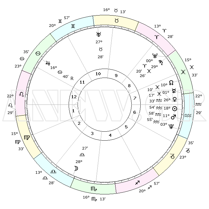 | | ΘΕΣΕΙΣ ΠΛΑΝΗΤΩΝ ΑΣΤΡΟΛΟΓΙΚΟΥ ΧΑΡΤΗ ΤΗΣ ΣΤΙΓΜΗΣ ΑΥΤΗΣ | | | | Πλανήτης | Ζώδιο | Μοίρες | Δεκαήμ. | Σε οίκο | Απόκλιση | | Ακμές των οίκων | | Ηλιος | Υδροχόος | 18°49' | Δεύτερο | 7 | 15 S 11 | | 1ος | 00°56' | Λέων | | Σελήνη | Ζυγός | 27°33' | Τρίτο | 4 | 14 S 16 | | 2ος | 22°02' | Λέων | | Ερμής | Ιχθείς | 01°09' | Πρώτο | 8 | 12 S 14 | | 3ος | 17°12' | Παρθένος | | Αφροδίτη | Υδροχόος | 26°28' | Τρίτο | 8 | 14 S 03 | | 4ος | 18°21' | Ζυγός | | Αρης | Υδροχόος | 11°55' | Δεύτερο | 7 | 18 S 14 | | 5ος | 24°23' | Σκορπιός | | Δίας | Καρκίνος | 16°40'R | Δεύτερο | 12 | 22 N 42 | | 6ος | 29°56' | Τοξότης | | Κρόνος | Ιχθείς | 29°26' | Τρίτο | 9 | 02 S 13 | | 7ος | 00°56' | Υδροχόος | | Ουρανός | Ταύρος | 27°28' | Τρίτο | 11 | 19 N 24 | | 8ος | 22°02' | Υδροχόος | | Ποσειδώνας | Κριός | 00°20' | Πρώτο | 9 | 01 S 04 | | 9ος | 17°12' | Ιχθείς | | Πλούτωνας | Υδροχόος | 03°55' | Πρώτο | 7 | 22 S 59 | | 10ος | 18°21' | Κριός | | Β. Δεσμός | Ιχθείς | 10°11' | Δεύτερο | 8 | 07 S 45 | | 11ος | 24°23' | Ταύρος | | Ωροσκόπος | Λέων | 00°56' | Πρώτο | | | 12ος | 29°56' | Δίδυμοι | | Μεσουράνημα | Κριός | 18°21' | Δεύτερο | | | |