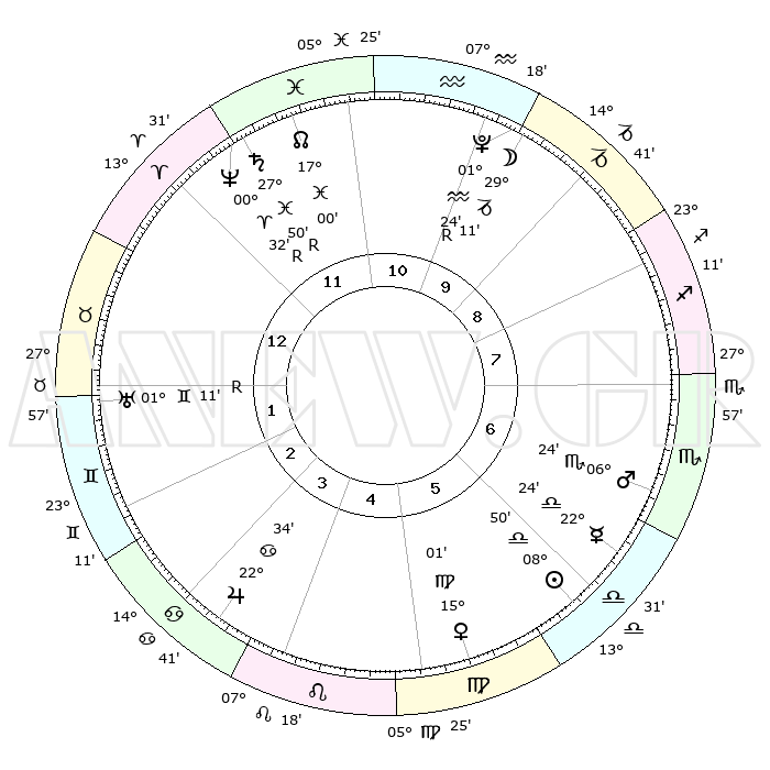 | ΘΕΣΕΙΣ ΠΛΑΝΗΤΩΝ ΑΣΤΡΟΛΟΓΙΚΟΥ ΧΑΡΤΗ ΤΗΣ ΣΤΙΓΜΗΣ ΑΥΤΗΣ | | Πλανήτης | Ζώδιο | Μοίρες | Δεκαήμ. | Σε οίκο | Απόκλιση | | Ακμές των οίκων | Ηλιος | Ζυγός | 08°45' | Πρώτο | 6 | 03 S 28 | | 1ος | 13°59' | Κριός | Σελήνη | Αιγόκερως | 28°05' | Τρίτο | 10 | 24 S 29 | | 2ος | 20°39' | Ταύρος | Ερμής | Ζυγός | 22°16' | Τρίτο | 7 | 08 S 50 | | 3ος | 16°04' | Δίδυμοι | Αφροδίτη | Παρθένος | 14°55' | Δεύτερο | 6 | 07 N 09 | | 4ος | 07°55' | Καρκίνος | Αρης | Σκορπιός | 06°20' | Πρώτο | 7 | 13 S 43 | | 5ος | 00°59' | Λέων | Δίας | Καρκίνος | 22°33' | Τρίτο | 4 | 21 N 34 | | 6ος | 00°42' | Παρθένος | Κρόνος | Ιχθείς | 27°50'R | Τρίτο | 12 | 03 S 10 | | 7ος | 13°59' | Ζυγός | Ουρανός | Δίδυμοι | 01°12'R | Πρώτο | 2 | 20 N 11 | | 8ος | 20°39' | Σκορπιός | Ποσειδώνας | Κριός | 00°32'R | Πρώτο | 12 | 01 S 03 | | 9ος | 16°04' | Τοξότης | Πλούτωνας | Υδροχόος | 01°24'R | Πρώτο | 11 | 23 S 32 | | 10ος | 07°55' | Αιγόκερως | Β. Δεσμός | Ιχθείς | 17°00' | Δεύτερο | 12 | 05 S 08 | | 11ος | 00°59' | Υδροχόος | Ωροσκόπος | Κριός | 13°59' | Δεύτερο | | | 12ος | 00°42' | Ιχθείς | Μεσουράνημα | Αιγόκερως | 07°55' | Πρώτο | | | |