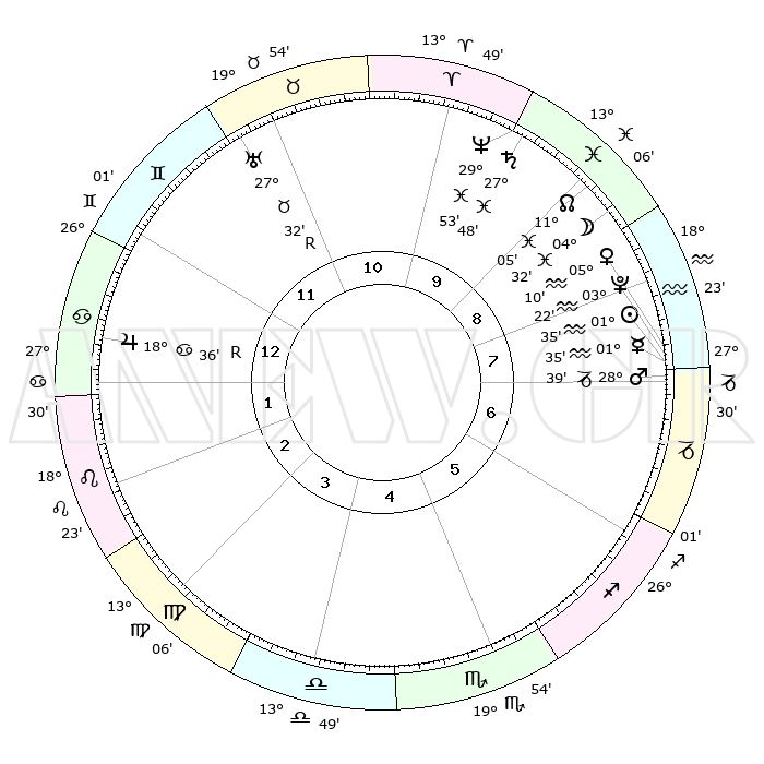 | | ΘΕΣΕΙΣ ΠΛΑΝΗΤΩΝ ΑΣΤΡΟΛΟΓΙΚΟΥ ΧΑΡΤΗ ΤΗΣ ΣΤΙΓΜΗΣ ΑΥΤΗΣ | | | | Πλανήτης | Ζώδιο | Μοίρες | Δεκαήμ. | Σε οίκο | Απόκλιση | | Ακμές των οίκων | | Ηλιος | Υδροχόος | 01°30' | Πρώτο | 8 | 19 S 49 | | 1ος | 02°09' | Καρκίνος | | Σελήνη | Ιχθείς | 03°28' | Πρώτο | 9 | 10 S 44 | | 2ος | 22°50' | Καρκίνος | | Ερμής | Υδροχόος | 01°27' | Πρώτο | 8 | 21 S 50 | | 3ος | 14°47' | Λέων | | Αφροδίτη | Υδροχόος | 05°04' | Πρώτο | 8 | 20 S 07 | | 4ος | 11°26' | Παρθένος | | Αρης | Αιγόκερως | 28°35' | Τρίτο | 8 | 21 S 25 | | 5ος | 15°43' | Ζυγός | | Δίας | Καρκίνος | 18°37'R | Δεύτερο | 1 | 22 N 25 | | 6ος | 25°33' | Σκορπιός | | Κρόνος | Ιχθείς | 27°47' | Τρίτο | 10 | 02 S 54 | | 7ος | 02°09' | Αιγόκερως | | Ουρανός | Ταύρος | 27°32'R | Τρίτο | 12 | 19 N 25 | | 8ος | 22°50' | Αιγόκερως | | Ποσειδώνας | Ιχθείς | 29°53' | Τρίτο | 10 | 01 S 16 | | 9ος | 14°47' | Υδροχόος | | Πλούτωνας | Υδροχόος | 03°22' | Πρώτο | 8 | 23 S 05 | | 10ος | 11°26' | Ιχθείς | | Β. Δεσμός | Ιχθείς | 11°05' | Δεύτερο | 9 | 07 S 24 | | 11ος | 15°43' | Κριός | | Ωροσκόπος | Καρκίνος | 02°09' | Πρώτο | | | 12ος | 25°33' | Ταύρος | | Μεσουράνημα | Ιχθείς | 11°26' | Δεύτερο | | | |