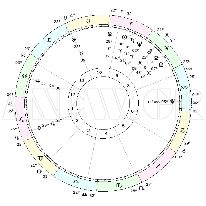 | | ΘΕΣΕΙΣ ΠΛΑΝΗΤΩΝ ΑΣΤΡΟΛΟΓΙΚΟΥ ΧΑΡΤΗ ΤΗΣ ΣΤΙΓΜΗΣ ΑΥΤΗΣ | | | | Πλανήτης | Ζώδιο | Μοίρες | Δεκαήμ. | Σε οίκο | Απόκλιση | | Ακμές των οίκων | | Ηλιος | Κριός | 08°44' | Πρώτο | 10 | 03 N 27 | | 1ος | 15°47' | Καρκίνος | | Σελήνη | Λέων | 24°38' | Τρίτο | 2 | 14 N 31 | | 2ος | 06°13' | Λέων | | Ερμής | Ιχθείς | 11°42' | Δεύτερο | 9 | 07 S 59 | | 3ος | 29°28' | Λέων | | Αφροδίτη | Κριός | 28°28' | Τρίτο | 10 | 10 N 25 | | 4ος | 28°24' | Παρθένος | | Αρης | Ιχθείς | 21°06' | Τρίτο | 9 | 04 S 30 | | 5ος | 04°10' | Σκορπιός | | Δίας | Καρκίνος | 15°37' | Δεύτερο | 12 | 22 N 53 | | 6ος | 12°15' | Τοξότης | | Κρόνος | Κριός | 05°20' | Πρώτο | 10 | 00 N 10 | | 7ος | 15°47' | Αιγόκερως | | Ουρανός | Ταύρος | 28°39' | Τρίτο | 11 | 19 N 41 | | 8ος | 06°13' | Υδροχόος | | Ποσειδώνας | Κριός | 02°07' | Πρώτο | 10 | 00 S 22 | | 9ος | 29°28' | Υδροχόος | | Πλούτωνας | Υδροχόος | 05°10' | Πρώτο | 7 | 22 S 48 | | 10ος | 28°24' | Ιχθείς | | Β. Δεσμός | Ιχθείς | 07°32' | Πρώτο | 9 | 08 S 44 | | 11ος | 04°10' | Ταύρος | | Ωροσκόπος | Καρκίνος | 15°47' | Δεύτερο | | | 12ος | 12°15' | Δίδυμοι | | Μεσουράνημα | Ιχθείς | 28°24' | Τρίτο | | | |