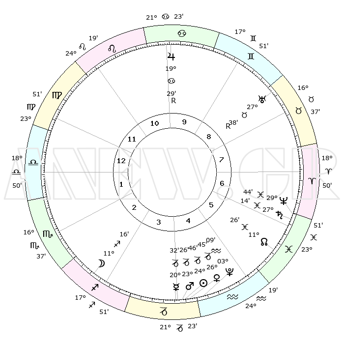 | | ΘΕΣΕΙΣ ΠΛΑΝΗΤΩΝ ΑΣΤΡΟΛΟΓΙΚΟΥ ΧΑΡΤΗ ΤΗΣ ΣΤΙΓΜΗΣ ΑΥΤΗΣ | | | | Πλανήτης | Ζώδιο | Μοίρες | Δεκαήμ. | Σε οίκο | Απόκλιση | | Ακμές των οίκων | | Ηλιος | Αιγόκερως | 24°41' | Τρίτο | 4 | 21 S 11 | | 1ος | 24°18' | Παρθένος | | Σελήνη | Τοξότης | 10°16' | Δεύτερο | 3 | 27 S 03 | | 2ος | 20°27' | Ζυγός | | Ερμής | Αιγόκερως | 20°24' | Τρίτο | 4 | 23 S 38 | | 3ος | 20°39' | Σκορπιός | | Αφροδίτη | Αιγόκερως | 26°38' | Τρίτο | 4 | 21 S 47 | | 4ος | 23°35' | Τοξότης | | Αρης | Αιγόκερως | 23°22' | Τρίτο | 4 | 22 S 22 | | 5ος | 26°40' | Αιγόκερως | | Δίας | Καρκίνος | 19°30'R | Δεύτερο | 10 | 22 N 17 | | 6ος | 27°19' | Υδροχόος | | Κρόνος | Ιχθείς | 27°14' | Τρίτο | 7 | 03 S 08 | | 7ος | 24°18' | Ιχθείς | | Ουρανός | Ταύρος | 27°38'R | Τρίτο | 9 | 19 N 26 | | 8ος | 20°27' | Κριός | | Ποσειδώνας | Ιχθείς | 29°44' | Τρίτο | 7 | 01 S 19 | | 9ος | 20°39' | Ταύρος | | Πλούτωνας | Υδροχόος | 03°09' | Πρώτο | 5 | 23 S 08 | | 10ος | 23°35' | Δίδυμοι | | Β. Δεσμός | Ιχθείς | 11°26' | Δεύτερο | 6 | 07 S 16 | | 11ος | 26°40' | Καρκίνος | | Ωροσκόπος | Παρθένος | 24°18' | Τρίτο | | | 12ος | 27°19' | Λέων | | Μεσουράνημα | Δίδυμοι | 23°35' | Τρίτο | | | |