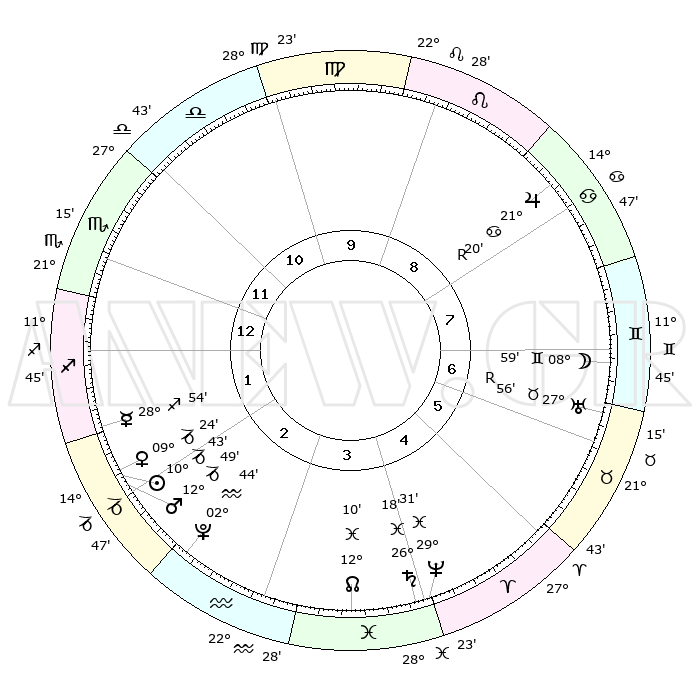 | | ΘΕΣΕΙΣ ΠΛΑΝΗΤΩΝ ΑΣΤΡΟΛΟΓΙΚΟΥ ΧΑΡΤΗ ΤΗΣ ΣΤΙΓΜΗΣ ΑΥΤΗΣ | | | | Πλανήτης | Ζώδιο | Μοίρες | Δεκαήμ. | Σε οίκο | Απόκλιση | | Ακμές των οίκων | | Ηλιος | Αιγόκερως | 10°38' | Δεύτερο | 2 | 23 S 00 | | 1ος | 17°54' | Σκορπιός | | Σελήνη | Δίδυμοι | 07°46' | Πρώτο | 7 | 26 N 35 | | 2ος | 17°38' | Τοξότης | | Ερμής | Τοξότης | 28°46' | Τρίτο | 2 | 24 S 00 | | 3ος | 21°30' | Αιγόκερως | | Αφροδίτη | Αιγόκερως | 09°18' | Πρώτο | 2 | 23 S 37 | | 4ος | 26°59' | Υδροχόος | | Αρης | Αιγόκερως | 12°45' | Δεύτερο | 2 | 23 S 43 | | 5ος | 29°12' | Ιχθείς | | Δίας | Καρκίνος | 21°21'R | Τρίτο | 8 | 21 N 59 | | 6ος | 25°53' | Κριός | | Κρόνος | Ιχθείς | 26°17' | Τρίτο | 4 | 03 S 33 | | 7ος | 17°54' | Ταύρος | | Ουρανός | Ταύρος | 27°57'R | Τρίτο | 7 | 19 N 30 | | 8ος | 17°38' | Δίδυμοι | | Ποσειδώνας | Ιχθείς | 29°31' | Τρίτο | 5 | 01 S 25 | | 9ος | 21°30' | Καρκίνος | | Πλούτωνας | Υδροχόος | 02°44' | Πρώτο | 3 | 23 S 13 | | 10ος | 26°59' | Λέων | | Β. Δεσμός | Ιχθείς | 12°10' | Δεύτερο | 4 | 07 S 00 | | 11ος | 29°12' | Παρθένος | | Ωροσκόπος | Σκορπιός | 17°54' | Δεύτερο | | | 12ος | 25°53' | Ζυγός | | Μεσουράνημα | Λέων | 26°59' | Τρίτο | | | |