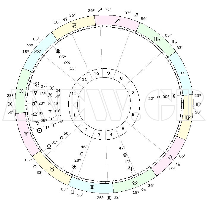 | | ΘΕΣΕΙΣ ΠΛΑΝΗΤΩΝ ΑΣΤΡΟΛΟΓΙΚΟΥ ΧΑΡΤΗ ΤΗΣ ΣΤΙΓΜΗΣ ΑΥΤΗΣ | | | | Πλανήτης | Ζώδιο | Μοίρες | Δεκαήμ. | Σε οίκο | Απόκλιση | | Ακμές των οίκων | | Ηλιος | Κριός | 11°19' | Δεύτερο | 2 | 04 N 29 | | 1ος | 28°17' | Αιγόκερως | | Σελήνη | Παρθένος | 28°59' | Τρίτο | 8 | 01 S 15 | | 2ος | 12°06' | Ιχθείς | | Ερμής | Ιχθείς | 13°44' | Δεύτερο | 2 | 07 S 36 | | 3ος | 20°48' | Κριός | | Αφροδίτη | Ταύρος | 01°42' | Πρώτο | 3 | 11 N 39 | | 4ος | 19°34' | Ταύρος | | Αρης | Ιχθείς | 23°09' | Τρίτο | 2 | 03 S 40 | | 5ος | 12°27' | Δίδυμοι | | Δίας | Καρκίνος | 15°47' | Δεύτερο | 6 | 22 N 52 | | 6ος | 03°49' | Καρκίνος | | Κρόνος | Κριός | 05°40' | Πρώτο | 2 | 00 N 18 | | 7ος | 28°17' | Καρκίνος | | Ουρανός | Ταύρος | 28°46' | Τρίτο | 4 | 19 N 43 | | 8ος | 12°06' | Παρθένος | | Ποσειδώνας | Κριός | 02°13' | Πρώτο | 2 | 00 S 19 | | 9ος | 20°48' | Ζυγός | | Πλούτωνας | Υδροχόος | 05°13' | Πρώτο | 1 | 22 S 47 | | 10ος | 19°34' | Σκορπιός | | Β. Δεσμός | Ιχθείς | 07°24' | Πρώτο | 1 | 08 S 47 | | 11ος | 12°27' | Τοξότης | | Ωροσκόπος | Αιγόκερως | 28°17' | Τρίτο | | | 12ος | 03°49' | Αιγόκερως | | Μεσουράνημα | Σκορπιός | 19°34' | Δεύτερο | | | |