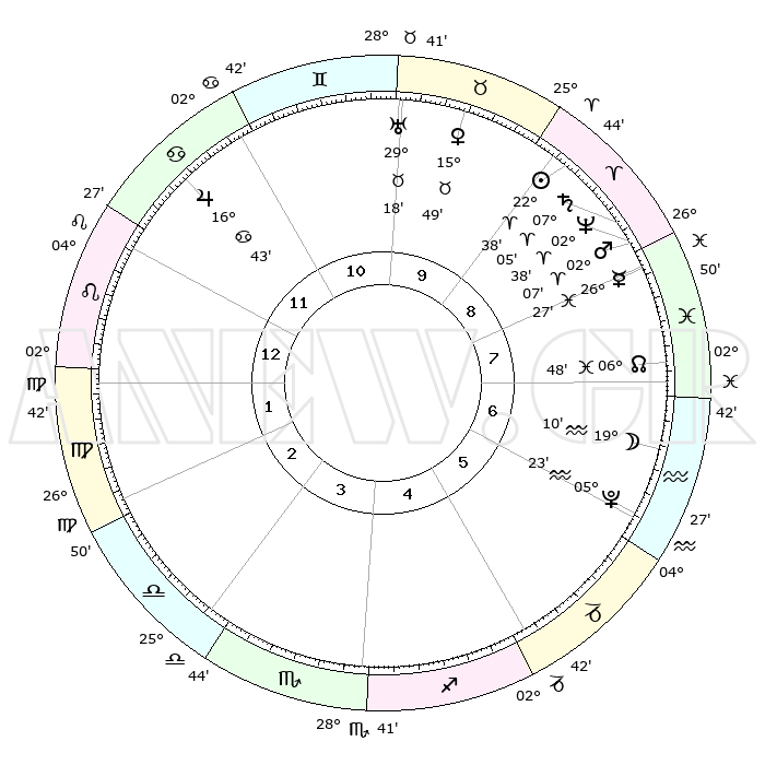 | | ΘΕΣΕΙΣ ΠΛΑΝΗΤΩΝ ΑΣΤΡΟΛΟΓΙΚΟΥ ΧΑΡΤΗ ΤΗΣ ΣΤΙΓΜΗΣ ΑΥΤΗΣ | | | | Πλανήτης | Ζώδιο | Μοίρες | Δεκαήμ. | Σε οίκο | Απόκλιση | | Ακμές των οίκων | | Ηλιος | Κριός | 22°33' | Τρίτο | 9 | 08 N 46 | | 1ος | 08°20' | Λέων | | Σελήνη | Υδροχόος | 18°06' | Δεύτερο | 7 | 17 S 05 | | 2ος | 00°01' | Παρθένος | | Ερμής | Ιχθείς | 26°20' | Τρίτο | 9 | 03 S 44 | | 3ος | 26°11' | Παρθένος | | Αφροδίτη | Ταύρος | 15°42' | Δεύτερο | 10 | 16 N 35 | | 4ος | 28°07' | Ζυγός | | Αρης | Κριός | 02°03' | Πρώτο | 9 | 00 S 06 | | 5ος | 03°49' | Τοξότης | | Δίας | Καρκίνος | 16°43' | Δεύτερο | 12 | 22 N 46 | | 6ος | 08°13' | Αιγόκερως | | Κρόνος | Κριός | 07°04' | Πρώτο | 9 | 00 N 50 | | 7ος | 08°20' | Υδροχόος | | Ουρανός | Ταύρος | 29°18' | Τρίτο | 10 | 19 N 50 | | 8ος | 00°01' | Ιχθείς | | Ποσειδώνας | Κριός | 02°38' | Πρώτο | 9 | 00 S 09 | | 9ος | 26°11' | Ιχθείς | | Πλούτωνας | Υδροχόος | 05°22' | Πρώτο | 6 | 22 S 47 | | 10ος | 28°07' | Κριός | | Β. Δεσμός | Ιχθείς | 06°48' | Πρώτο | 8 | 09 S 01 | | 11ος | 03°49' | Δίδυμοι | | Ωροσκόπος | Λέων | 08°20' | Πρώτο | | | 12ος | 08°13' | Καρκίνος | | Μεσουράνημα | Κριός | 28°07' | Τρίτο | | | |