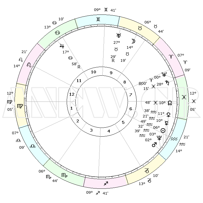 | | ΘΕΣΕΙΣ ΠΛΑΝΗΤΩΝ ΑΣΤΡΟΛΟΓΙΚΟΥ ΧΑΡΤΗ ΤΗΣ ΣΤΙΓΜΗΣ ΑΥΤΗΣ | | | | Πλανήτης | Ζώδιο | Μοίρες | Δεκαήμ. | Σε οίκο | Απόκλιση | | Ακμές των οίκων | | Ηλιος | Υδροχόος | 06°44' | Πρώτο | 6 | 18 S 35 | | 1ος | 19°13' | Λέων | | Σελήνη | Ταύρος | 13°12' | Δεύτερο | 10 | 20 N 15 | | 2ος | 11°57' | Παρθένος | | Ερμής | Υδροχόος | 10°12' | Δεύτερο | 6 | 19 S 41 | | 3ος | 09°30' | Ζυγός | | Αφροδίτη | Υδροχόος | 11°32' | Δεύτερο | 6 | 18 S 32 | | 4ος | 12°08' | Σκορπιός | | Αρης | Υδροχόος | 02°35' | Πρώτο | 6 | 20 S 34 | | 5ος | 17°06' | Τοξότης | | Δίας | Καρκίνος | 17°58'R | Δεύτερο | 11 | 22 N 31 | | 6ος | 20°05' | Αιγόκερως | | Κρόνος | Ιχθείς | 28°15' | Τρίτο | 8 | 02 S 42 | | 7ος | 19°13' | Υδροχόος | | Ουρανός | Ταύρος | 27°29'R | Τρίτο | 10 | 19 N 24 | | 8ος | 11°57' | Ιχθείς | | Ποσειδώνας | Κριός | 00°00'R | Πρώτο | 8 | 01 S 12 | | 9ος | 09°30' | Κριός | | Πλούτωνας | Υδροχόος | 03°32' | Πρώτο | 6 | 23 S 03 | | 10ος | 12°08' | Ταύρος | | Β. Δεσμός | Ιχθείς | 10°49' | Δεύτερο | 7 | 07 S 31 | | 11ος | 17°06' | Δίδυμοι | | Ωροσκόπος | Λέων | 19°13' | Δεύτερο | | | 12ος | 20°05' | Καρκίνος | | Μεσουράνημα | Ταύρος | 12°08' | Δεύτερο | | | |