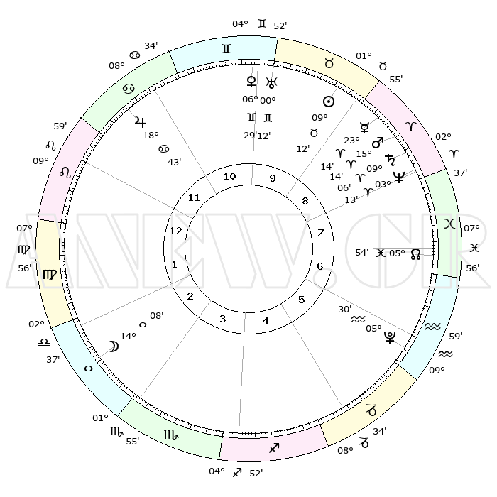 | | ΘΕΣΕΙΣ ΠΛΑΝΗΤΩΝ ΑΣΤΡΟΛΟΓΙΚΟΥ ΧΑΡΤΗ ΤΗΣ ΣΤΙΓΜΗΣ ΑΥΤΗΣ | | | | Πλανήτης | Ζώδιο | Μοίρες | Δεκαήμ. | Σε οίκο | Απόκλιση | | Ακμές των οίκων | | Ηλιος | Ταύρος | 09°10' | Πρώτο | 9 | 14 N 33 | | 1ος | 27°12' | Λέων | | Σελήνη | Ζυγός | 13°40' | Δεύτερο | 2 | 08 S 10 | | 2ος | 20°46' | Παρθένος | | Ερμής | Κριός | 23°10' | Τρίτο | 9 | 07 N 04 | | 3ος | 19°11' | Ζυγός | | Αφροδίτη | Δίδυμοι | 06°27' | Πρώτο | 10 | 22 N 12 | | 4ος | 22°03' | Σκορπιός | | Αρης | Κριός | 15°13' | Δεύτερο | 8 | 05 N 10 | | 5ος | 26°26' | Τοξότης | | Δίας | Καρκίνος | 18°42' | Δεύτερο | 11 | 22 N 31 | | 6ος | 28°38' | Αιγόκερως | | Κρόνος | Κριός | 09°05' | Πρώτο | 8 | 01 N 36 | | 7ος | 27°12' | Υδροχόος | | Ουρανός | Δίδυμοι | 00°12' | Πρώτο | 10 | 20 N 01 | | 8ος | 20°46' | Ιχθείς | | Ποσειδώνας | Κριός | 03°13' | Πρώτο | 8 | 00 N 04 | | 9ος | 19°11' | Κριός | | Πλούτωνας | Υδροχόος | 05°30' | Πρώτο | 6 | 22 S 49 | | 10ος | 22°03' | Ταύρος | | Β. Δεσμός | Ιχθείς | 05°54' | Πρώτο | 7 | 09 S 21 | | 11ος | 26°26' | Δίδυμοι | | Ωροσκόπος | Λέων | 27°12' | Τρίτο | | | 12ος | 28°38' | Καρκίνος | | Μεσουράνημα | Ταύρος | 22°03' | Τρίτο | | | |