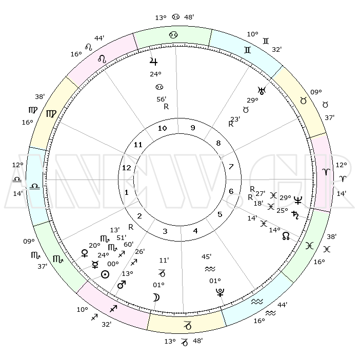 | | ΘΕΣΕΙΣ ΠΛΑΝΗΤΩΝ ΑΣΤΡΟΛΟΓΙΚΟΥ ΧΑΡΤΗ ΤΗΣ ΣΤΙΓΜΗΣ ΑΥΤΗΣ | | | | Πλανήτης | Ζώδιο | Μοίρες | Δεκαήμ. | Σε οίκο | Απόκλιση | | Ακμές των οίκων | | Ηλιος | Τοξότης | 00°56' | Πρώτο | 3 | 20 S 20 | | 1ος | 24°13' | Παρθένος | | Σελήνη | Αιγόκερως | 00°27' | Πρώτο | 4 | 28 S 15 | | 2ος | 20°22' | Ζυγός | | Ερμής | Σκορπιός | 24°55'R | Τρίτο | 3 | 17 S 40 | | 3ος | 20°34' | Σκορπιός | | Αφροδίτη | Σκορπιός | 20°09' | Τρίτο | 2 | 16 S 50 | | 4ος | 23°30' | Τοξότης | | Αρης | Τοξότης | 13°24' | Δεύτερο | 3 | 23 S 00 | | 5ος | 26°35' | Αιγόκερως | | Δίας | Καρκίνος | 24°56'R | Τρίτο | 10 | 21 N 16 | | 6ος | 27°14' | Υδροχόος | | Κρόνος | Ιχθείς | 25°18'R | Τρίτο | 7 | 04 S 04 | | 7ος | 24°13' | Ιχθείς | | Ουρανός | Ταύρος | 29°23'R | Τρίτο | 9 | 19 N 49 | | 8ος | 20°22' | Κριός | | Ποσειδώνας | Ιχθείς | 29°27'R | Τρίτο | 7 | 01 S 28 | | 9ος | 20°34' | Ταύρος | | Πλούτωνας | Υδροχόος | 01°45' | Πρώτο | 5 | 23 S 26 | | 10ος | 23°30' | Δίδυμοι | | Β. Δεσμός | Ιχθείς | 14°14' | Δεύτερο | 6 | 06 S 12 | | 11ος | 26°35' | Καρκίνος | | Ωροσκόπος | Παρθένος | 24°13' | Τρίτο | | | 12ος | 27°14' | Λέων | | Μεσουράνημα | Δίδυμοι | 23°30' | Τρίτο | | | |