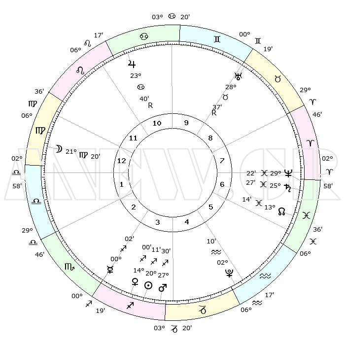 | | ΘΕΣΕΙΣ ΠΛΑΝΗΤΩΝ ΑΣΤΡΟΛΟΓΙΚΟΥ ΧΑΡΤΗ ΤΗΣ ΣΤΙΓΜΗΣ ΑΥΤΗΣ | | | | Πλανήτης | Ζώδιο | Μοίρες | Δεκαήμ. | Σε οίκο | Απόκλιση | | Ακμές των οίκων | | Ηλιος | Τοξότης | 20°10' | Τρίτο | 3 | 23 S 04 | | 1ος | 28°27' | Παρθένος | | Σελήνη | Παρθένος | 21°09' | Τρίτο | 12 | 02 N 52 | | 2ος | 24°56' | Ζυγός | | Ερμής | Τοξότης | 00°01' | Πρώτο | 3 | 18 S 17 | | 3ος | 25°18' | Σκορπιός | | Αφροδίτη | Τοξότης | 13°59' | Δεύτερο | 3 | 22 S 11 | | 4ος | 28°16' | Τοξότης | | Αρης | Τοξότης | 27°29' | Τρίτο | 3 | 24 S 10 | | 5ος | 01°16' | Υδροχόος | | Δίας | Καρκίνος | 23°40'R | Τρίτο | 10 | 21 N 33 | | 6ος | 01°46' | Ιχθείς | | Κρόνος | Ιχθείς | 25°27' | Τρίτο | 6 | 03 S 57 | | 7ος | 28°27' | Ιχθείς | | Ουρανός | Ταύρος | 28°37'R | Τρίτο | 9 | 19 N 39 | | 8ος | 24°56' | Κριός | | Ποσειδώνας | Ιχθείς | 29°22' | Τρίτο | 7 | 01 S 29 | | 9ος | 25°18' | Ταύρος | | Πλούτωνας | Υδροχόος | 02°10' | Πρώτο | 5 | 23 S 20 | | 10ος | 28°16' | Δίδυμοι | | Β. Δεσμός | Ιχθείς | 13°14' | Δεύτερο | 6 | 06 S 35 | | 11ος | 01°16' | Λέων | | Ωροσκόπος | Παρθένος | 28°27' | Τρίτο | | | 12ος | 01°46' | Παρθένος | | Μεσουράνημα | Δίδυμοι | 28°16' | Τρίτο | | | |