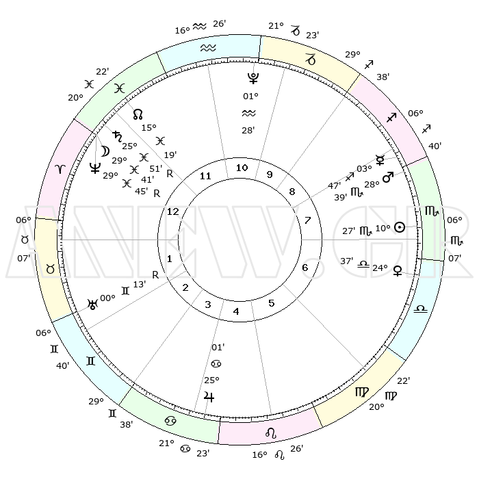 | | ΘΕΣΕΙΣ ΠΛΑΝΗΤΩΝ ΑΣΤΡΟΛΟΓΙΚΟΥ ΧΑΡΤΗ ΤΗΣ ΣΤΙΓΜΗΣ ΑΥΤΗΣ | | | | Πλανήτης | Ζώδιο | Μοίρες | Δεκαήμ. | Σε οίκο | Απόκλιση | | Ακμές των οίκων | | Ηλιος | Σκορπιός | 09°50' | Πρώτο | 3 | 14 S 45 | | 1ος | 13°41' | Παρθένος | | Σελήνη | Ιχθείς | 20°53' | Τρίτο | 7 | 03 S 18 | | 2ος | 08°54' | Ζυγός | | Ερμής | Τοξότης | 03°17' | Πρώτο | 3 | 23 S 39 | | 3ος | 08°35' | Σκορπιός | | Αφροδίτη | Ζυγός | 23°51' | Τρίτο | 2 | 07 S 53 | | 4ος | 11°32' | Τοξότης | | Αρης | Σκορπιός | 28°12' | Τρίτο | 3 | 20 S 09 | | 5ος | 14°57' | Αιγόκερως | | Δίας | Καρκίνος | 24°60' | Τρίτο | 11 | 21 N 13 | | 6ος | 16°03' | Υδροχόος | | Κρόνος | Ιχθείς | 25°53'R | Τρίτο | 7 | 03 S 54 | | 7ος | 13°41' | Ιχθείς | | Ουρανός | Δίδυμοι | 00°14'R | Πρώτο | 9 | 19 N 59 | | 8ος | 08°54' | Κριός | | Ποσειδώνας | Ιχθείς | 29°46'R | Τρίτο | 7 | 01 S 21 | | 9ος | 08°35' | Ταύρος | | Πλούτωνας | Υδροχόος | 01°27' | Πρώτο | 5 | 23 S 31 | | 10ος | 11°32' | Δίδυμοι | | Β. Δεσμός | Ιχθείς | 15°21' | Δεύτερο | 7 | 05 S 46 | | 11ος | 14°57' | Καρκίνος | | Ωροσκόπος | Παρθένος | 13°41' | Δεύτερο | | | 12ος | 16°03' | Λέων | | Μεσουράνημα | Δίδυμοι | 11°32' | Δεύτερο | | | |