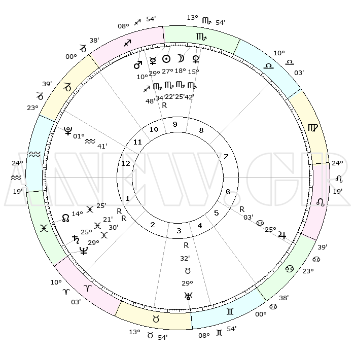 | | ΘΕΣΕΙΣ ΠΛΑΝΗΤΩΝ ΑΣΤΡΟΛΟΓΙΚΟΥ ΧΑΡΤΗ ΤΗΣ ΣΤΙΓΜΗΣ ΑΥΤΗΣ | | | | Πλανήτης | Ζώδιο | Μοίρες | Δεκαήμ. | Σε οίκο | Απόκλιση | | Ακμές των οίκων | | Ηλιος | Σκορπιός | 27°19' | Τρίτο | 10 | 19 S 33 | | 1ος | 28°01' | Αιγόκερως | | Σελήνη | Σκορπιός | 17°45' | Δεύτερο | 9 | 21 S 22 | | 2ος | 11°47' | Ιχθείς | | Ερμής | Σκορπιός | 29°39'R | Τρίτο | 10 | 19 S 52 | | 3ος | 20°32' | Κριός | | Αφροδίτη | Σκορπιός | 15°38' | Δεύτερο | 9 | 15 S 29 | | 4ος | 19°20' | Ταύρος | | Αρης | Τοξότης | 10°46' | Δεύτερο | 10 | 22 S 37 | | 5ος | 12°15' | Δίδυμοι | | Δίας | Καρκίνος | 25°03'R | Τρίτο | 6 | 21 N 15 | | 6ος | 03°36' | Καρκίνος | | Κρόνος | Ιχθείς | 25°21'R | Τρίτο | 2 | 04 S 04 | | 7ος | 28°01' | Καρκίνος | | Ουρανός | Ταύρος | 29°32'R | Τρίτο | 4 | 19 N 51 | | 8ος | 11°47' | Παρθένος | | Ποσειδώνας | Ιχθείς | 29°30'R | Τρίτο | 2 | 01 S 27 | | 9ος | 20°32' | Ζυγός | | Πλούτωνας | Υδροχόος | 01°41' | Πρώτο | 1 | 23 S 27 | | 10ος | 19°20' | Σκορπιός | | Β. Δεσμός | Ιχθείς | 14°26' | Δεύτερο | 2 | 06 S 08 | | 11ος | 12°15' | Τοξότης | | Ωροσκόπος | Αιγόκερως | 28°01' | Τρίτο | | | 12ος | 03°36' | Αιγόκερως | | Μεσουράνημα | Σκορπιός | 19°20' | Δεύτερο | | | |