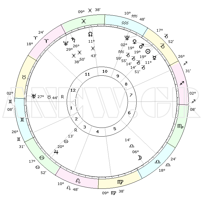 | | ΘΕΣΕΙΣ ΠΛΑΝΗΤΩΝ ΑΣΤΡΟΛΟΓΙΚΟΥ ΧΑΡΤΗ ΤΗΣ ΣΤΙΓΜΗΣ ΑΥΤΗΣ | | | | Πλανήτης | Ζώδιο | Μοίρες | Δεκαήμ. | Σε οίκο | Απόκλιση | | Ακμές των οίκων | | Ηλιος | Αιγόκερως | 18°26' | Δεύτερο | 6 | 22 S 10 | | 1ος | 08°37' | Λέων | | Σελήνη | Παρθένος | 26°15' | Τρίτο | 2 | 00 N 12 | | 2ος | 00°19' | Παρθένος | | Ερμής | Αιγόκερως | 10°36' | Δεύτερο | 6 | 24 S 20 | | 3ος | 26°32' | Παρθένος | | Αφροδίτη | Αιγόκερως | 18°55' | Δεύτερο | 6 | 22 S 52 | | 4ος | 28°29' | Ζυγός | | Αρης | Αιγόκερως | 18°37' | Δεύτερο | 6 | 23 S 04 | | 5ος | 04°10' | Τοξότης | | Δίας | Καρκίνος | 20°20'R | Τρίτο | 12 | 22 N 09 | | 6ος | 08°32' | Αιγόκερως | | Κρόνος | Ιχθείς | 26°47' | Τρίτο | 9 | 03 S 20 | | 7ος | 08°37' | Υδροχόος | | Ουρανός | Ταύρος | 27°45'R | Τρίτο | 10 | 19 N 28 | | 8ος | 00°19' | Ιχθείς | | Ποσειδώνας | Ιχθείς | 29°37' | Τρίτο | 9 | 01 S 22 | | 9ος | 26°32' | Ιχθείς | | Πλούτωνας | Υδροχόος | 02°58' | Πρώτο | 6 | 23 S 10 | | 10ος | 28°29' | Κριός | | Β. Δεσμός | Ιχθείς | 11°46' | Δεύτερο | 8 | 07 S 09 | | 11ος | 04°10' | Δίδυμοι | | Ωροσκόπος | Λέων | 08°37' | Πρώτο | | | 12ος | 08°32' | Καρκίνος | | Μεσουράνημα | Κριός | 28°29' | Τρίτο | | | |
