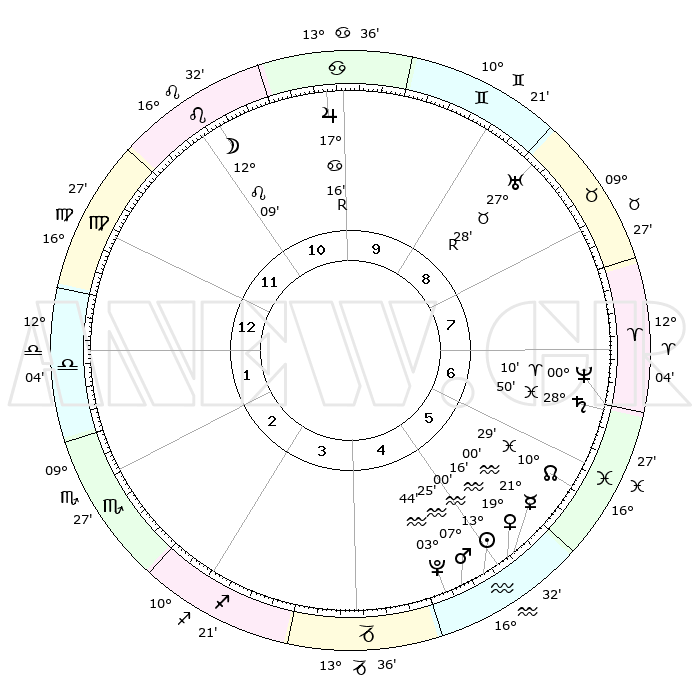 | | ΘΕΣΕΙΣ ΠΛΑΝΗΤΩΝ ΑΣΤΡΟΛΟΓΙΚΟΥ ΧΑΡΤΗ ΤΗΣ ΣΤΙΓΜΗΣ ΑΥΤΗΣ | | | | Πλανήτης | Ζώδιο | Μοίρες | Δεκαήμ. | Σε οίκο | Απόκλιση | | Ακμές των οίκων | | Ηλιος | Υδροχόος | 12°56' | Δεύτερο | 5 | 16 S 56 | | 1ος | 22°49' | Παρθένος | | Σελήνη | Λέων | 11°14' | Δεύτερο | 11 | 19 N 45 | | 2ος | 18°51' | Ζυγός | | Ερμής | Υδροχόος | 20°53' | Τρίτο | 5 | 16 S 16 | | 3ος | 18°60' | Σκορπιός | | Αφροδίτη | Υδροχόος | 19°11' | Δεύτερο | 5 | 16 S 22 | | 4ος | 21°55' | Τοξότης | | Αρης | Υδροχόος | 07°21' | Πρώτο | 5 | 19 S 26 | | 5ος | 25°02' | Αιγόκερως | | Δίας | Καρκίνος | 17°16'R | Δεύτερο | 10 | 22 N 37 | | 6ος | 25°44' | Υδροχόος | | Κρόνος | Ιχθείς | 28°50' | Τρίτο | 7 | 02 S 27 | | 7ος | 22°49' | Ιχθείς | | Ουρανός | Ταύρος | 27°28'R | Τρίτο | 9 | 19 N 24 | | 8ος | 18°51' | Κριός | | Ποσειδώνας | Κριός | 00°10' | Πρώτο | 7 | 01 S 08 | | 9ος | 18°60' | Ταύρος | | Πλούτωνας | Υδροχόος | 03°44' | Πρώτο | 5 | 23 S 01 | | 10ος | 21°55' | Δίδυμοι | | Β. Δεσμός | Ιχθείς | 10°29' | Δεύτερο | 6 | 07 S 38 | | 11ος | 25°02' | Καρκίνος | | Ωροσκόπος | Παρθένος | 22°49' | Τρίτο | | | 12ος | 25°44' | Λέων | | Μεσουράνημα | Δίδυμοι | 21°55' | Τρίτο | | | |