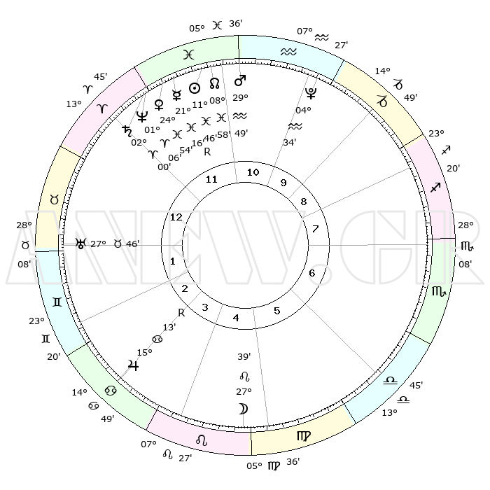 | | ΘΕΣΕΙΣ ΠΛΑΝΗΤΩΝ ΑΣΤΡΟΛΟΓΙΚΟΥ ΧΑΡΤΗ ΤΗΣ ΣΤΙΓΜΗΣ ΑΥΤΗΣ | | | | Πλανήτης | Ζώδιο | Μοίρες | Δεκαήμ. | Σε οίκο | Απόκλιση | | Ακμές των οίκων | | Ηλιος | Ιχθείς | 11°42' | Δεύτερο | 11 | 07 S 10 | | 1ος | 27°55' | Κριός | | Σελήνη | Λέων | 26°48' | Τρίτο | 5 | 13 N 37 | | 2ος | 00°43' | Δίδυμοι | | Ερμής | Ιχθείς | 21°18'R | Τρίτο | 12 | 00 S 15 | | 3ος | 24°30' | Δίδυμοι | | Αφροδίτη | Ιχθείς | 24°50' | Τρίτο | 12 | 03 S 17 | | 4ος | 16°11' | Καρκίνος | | Αρης | Υδροχόος | 29°46' | Τρίτο | 11 | 12 S 35 | | 5ος | 10°23' | Λέων | | Δίας | Καρκίνος | 15°13'R | Δεύτερο | 3 | 22 N 55 | | 6ος | 12°41' | Παρθένος | | Κρόνος | Κριός | 01°60' | Πρώτο | 12 | 01 S 10 | | 7ος | 27°55' | Ζυγός | | Ουρανός | Ταύρος | 27°46' | Τρίτο | 1 | 19 N 29 | | 8ος | 00°43' | Τοξότης | | Ποσειδώνας | Κριός | 01°06' | Πρώτο | 12 | 00 S 46 | | 9ος | 24°30' | Τοξότης | | Πλούτωνας | Υδροχόος | 04°34' | Πρώτο | 10 | 22 S 52 | | 10ος | 16°11' | Αιγόκερως | | Β. Δεσμός | Ιχθείς | 08°59' | Πρώτο | 11 | 08 S 12 | | 11ος | 10°23' | Υδροχόος | | Ωροσκόπος | Κριός | 27°55' | Τρίτο | | | 12ος | 12°41' | Ιχθείς | | Μεσουράνημα | Αιγόκερως | 16°11' | Δεύτερο | | | |