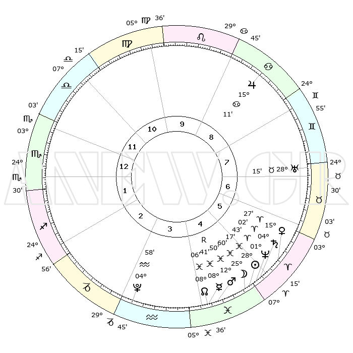 | | ΘΕΣΕΙΣ ΠΛΑΝΗΤΩΝ ΑΣΤΡΟΛΟΓΙΚΟΥ ΧΑΡΤΗ ΤΗΣ ΣΤΙΓΜΗΣ ΑΥΤΗΣ | | | | Πλανήτης | Ζώδιο | Μοίρες | Δεκαήμ. | Σε οίκο | Απόκλιση | | Ακμές των οίκων | | Ηλιος | Ιχθείς | 28°13' | Τρίτο | 5 | 00 S 43 | | 1ος | 03°46' | Σκορπιός | | Σελήνη | Ιχθείς | 25°00' | Τρίτο | 5 | 00 S 39 | | 2ος | 02°25' | Τοξότης | | Ερμής | Ιχθείς | 08°42'R | Πρώτο | 4 | 06 S 56 | | 3ος | 04°41' | Αιγόκερως | | Αφροδίτη | Κριός | 15°21' | Δεύτερο | 6 | 05 N 11 | | 4ος | 09°09' | Υδροχόος | | Αρης | Ιχθείς | 12°47' | Δεύτερο | 5 | 07 S 46 | | 5ος | 12°00' | Ιχθείς | | Δίας | Καρκίνος | 15°11' | Δεύτερο | 9 | 22 N 56 | | 6ος | 10°19' | Κριός | | Κρόνος | Κριός | 04°01' | Πρώτο | 5 | 00 S 21 | | 7ος | 03°46' | Ταύρος | | Ουρανός | Ταύρος | 28°15' | Τρίτο | 7 | 19 N 36 | | 8ος | 02°25' | Δίδυμοι | | Ποσειδώνας | Κριός | 01°43' | Πρώτο | 5 | 00 S 31 | | 9ος | 04°41' | Καρκίνος | | Πλούτωνας | Υδροχόος | 04°58' | Πρώτο | 3 | 22 S 49 | | 10ος | 09°09' | Λέων | | Β. Δεσμός | Ιχθείς | 08°06' | Πρώτο | 4 | 08 S 32 | | 11ος | 12°00' | Παρθένος | | Ωροσκόπος | Σκορπιός | 03°46' | Πρώτο | | | 12ος | 10°19' | Ζυγός | | Μεσουράνημα | Λέων | 09°09' | Πρώτο | | | |