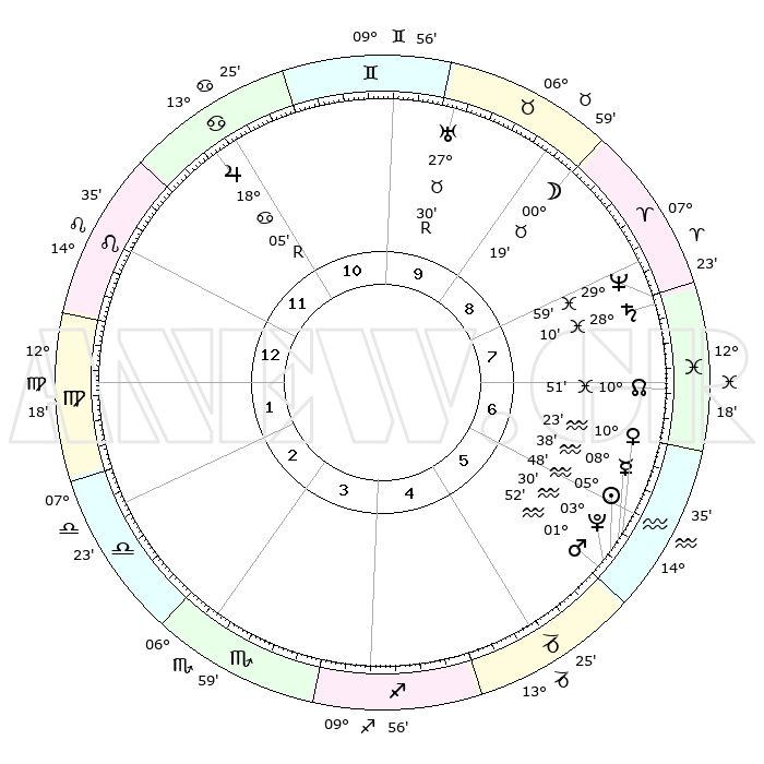 | | ΘΕΣΕΙΣ ΠΛΑΝΗΤΩΝ ΑΣΤΡΟΛΟΓΙΚΟΥ ΧΑΡΤΗ ΤΗΣ ΣΤΙΓΜΗΣ ΑΥΤΗΣ | | | | Πλανήτης | Ζώδιο | Μοίρες | Δεκαήμ. | Σε οίκο | Απόκλιση | | Ακμές των οίκων | | Ηλιος | Υδροχόος | 05°45' | Πρώτο | 6 | 18 S 50 | | 1ος | 25°41' | Λέων | | Σελήνη | Κριός | 29°31' | Τρίτο | 9 | 15 N 02 | | 2ος | 19°05' | Παρθένος | | Ερμής | Υδροχόος | 08°32' | Πρώτο | 6 | 20 S 08 | | 3ος | 17°20' | Ζυγός | | Αφροδίτη | Υδροχόος | 10°18' | Δεύτερο | 6 | 18 S 51 | | 4ος | 20°11' | Σκορπιός | | Αρης | Υδροχόος | 01°50' | Πρώτο | 6 | 20 S 44 | | 5ος | 24°40' | Τοξότης | | Δίας | Καρκίνος | 18°06'R | Δεύτερο | 11 | 22 N 30 | | 6ος | 26°60' | Αιγόκερως | | Κρόνος | Ιχθείς | 28°10' | Τρίτο | 8 | 02 S 44 | | 7ος | 25°41' | Υδροχόος | | Ουρανός | Ταύρος | 27°30'R | Τρίτο | 10 | 19 N 25 | | 8ος | 19°05' | Ιχθείς | | Ποσειδώνας | Ιχθείς | 29°59' | Τρίτο | 8 | 01 S 13 | | 9ος | 17°20' | Κριός | | Πλούτωνας | Υδροχόος | 03°30' | Πρώτο | 6 | 23 S 04 | | 10ος | 20°11' | Ταύρος | | Β. Δεσμός | Ιχθείς | 10°52' | Δεύτερο | 7 | 07 S 30 | | 11ος | 24°40' | Δίδυμοι | | Ωροσκόπος | Λέων | 25°41' | Τρίτο | | | 12ος | 26°60' | Καρκίνος | | Μεσουράνημα | Ταύρος | 20°11' | Τρίτο | | | |