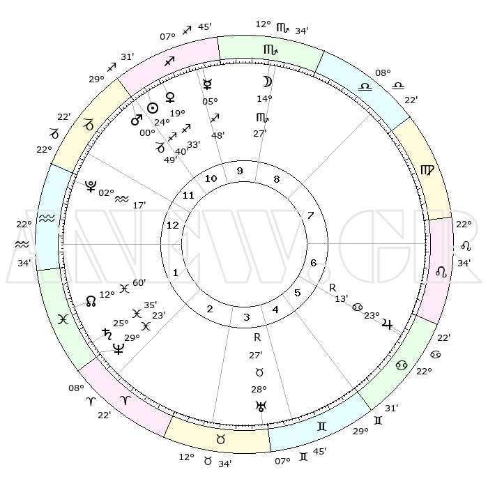 | | ΘΕΣΕΙΣ ΠΛΑΝΗΤΩΝ ΑΣΤΡΟΛΟΓΙΚΟΥ ΧΑΡΤΗ ΤΗΣ ΣΤΙΓΜΗΣ ΑΥΤΗΣ | | | | Πλανήτης | Ζώδιο | Μοίρες | Δεκαήμ. | Σε οίκο | Απόκλιση | | Ακμές των οίκων | | Ηλιος | Τοξότης | 24°16' | Τρίτο | 3 | 23 S 18 | | 1ος | 12°56' | Ζυγός | | Σελήνη | Σκορπιός | 09°51' | Πρώτο | 1 | 18 S 45 | | 2ος | 10°22' | Σκορπιός | | Ερμής | Τοξότης | 05°16' | Πρώτο | 2 | 19 S 47 | | 3ος | 11°19' | Τοξότης | | Αφροδίτη | Τοξότης | 19°04' | Δεύτερο | 3 | 22 S 52 | | 4ος | 14°36' | Αιγόκερως | | Αρης | Αιγόκερως | 00°31' | Πρώτο | 3 | 24 S 13 | | 5ος | 17°32' | Υδροχόος | | Δίας | Καρκίνος | 23°16'R | Τρίτο | 10 | 21 N 37 | | 6ος | 17°24' | Ιχθείς | | Κρόνος | Ιχθείς | 25°34' | Τρίτο | 6 | 03 S 53 | | 7ος | 12°56' | Κριός | | Ουρανός | Ταύρος | 28°28'R | Τρίτο | 8 | 19 N 37 | | 8ος | 10°22' | Ταύρος | | Ποσειδώνας | Ιχθείς | 29°23' | Τρίτο | 6 | 01 S 29 | | 9ος | 11°19' | Δίδυμοι | | Πλούτωνας | Υδροχόος | 02°16' | Πρώτο | 4 | 23 S 19 | | 10ος | 14°36' | Καρκίνος | | Β. Δεσμός | Ιχθείς | 13°01' | Δεύτερο | 5 | 06 S 40 | | 11ος | 17°32' | Λέων | | Ωροσκόπος | Ζυγός | 12°56' | Δεύτερο | | | 12ος | 17°24' | Παρθένος | | Μεσουράνημα | Καρκίνος | 14°36' | Δεύτερο | | | |