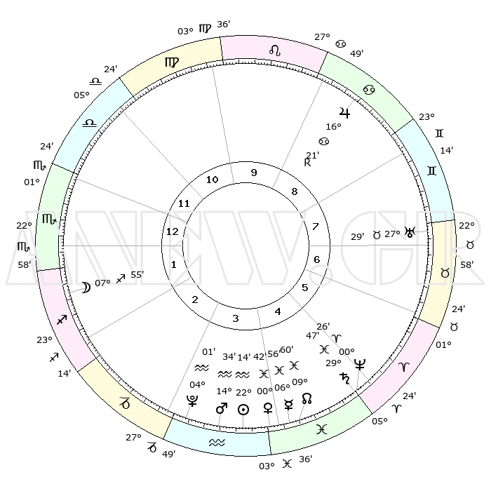 | | ΘΕΣΕΙΣ ΠΛΑΝΗΤΩΝ ΑΣΤΡΟΛΟΓΙΚΟΥ ΧΑΡΤΗ ΤΗΣ ΣΤΙΓΜΗΣ ΑΥΤΗΣ | | | | Πλανήτης | Ζώδιο | Μοίρες | Δεκαήμ. | Σε οίκο | Απόκλιση | | Ακμές των οίκων | | Ηλιος | Υδροχόος | 22°11' | Τρίτο | 4 | 14 S 07 | | 1ος | 05°17' | Σκορπιός | | Σελήνη | Τοξότης | 07°12' | Πρώτο | 2 | 26 S 41 | | 2ος | 04°01' | Τοξότης | | Ερμής | Ιχθείς | 06°50' | Πρώτο | 4 | 09 S 42 | | 3ος | 06°26' | Αιγόκερως | | Αφροδίτη | Ιχθείς | 00°37' | Πρώτο | 4 | 12 S 37 | | 4ος | 10°60' | Υδροχόος | | Αρης | Υδροχόος | 14°31' | Δεύτερο | 4 | 17 S 30 | | 5ος | 13°49' | Ιχθείς | | Δίας | Καρκίνος | 16°22'R | Δεύτερο | 9 | 22 N 45 | | 6ος | 11°59' | Κριός | | Κρόνος | Ιχθείς | 29°47' | Τρίτο | 5 | 02 S 04 | | 7ος | 05°16' | Ταύρος | | Ουρανός | Ταύρος | 27°29' | Τρίτο | 7 | 19 N 25 | | 8ος | 04°01' | Δίδυμοι | | Ποσειδώνας | Κριός | 00°26' | Πρώτο | 5 | 01 S 02 | | 9ος | 06°26' | Καρκίνος | | Πλούτωνας | Υδροχόος | 04°01' | Πρώτο | 3 | 22 S 58 | | 10ος | 10°60' | Λέων | | Β. Δεσμός | Ιχθείς | 10°00' | Δεύτερο | 4 | 07 S 49 | | 11ος | 13°49' | Παρθένος | | Ωροσκόπος | Σκορπιός | 05°17' | Πρώτο | | | 12ος | 11°58' | Ζυγός | | Μεσουράνημα | Λέων | 10°60' | Δεύτερο | | | |