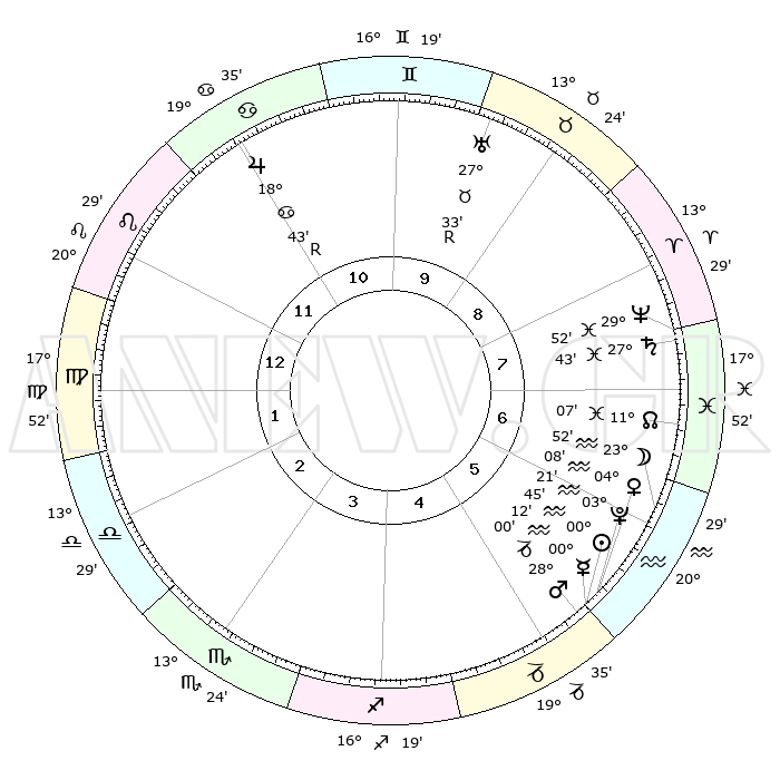 | | ΘΕΣΕΙΣ ΠΛΑΝΗΤΩΝ ΑΣΤΡΟΛΟΓΙΚΟΥ ΧΑΡΤΗ ΤΗΣ ΣΤΙΓΜΗΣ ΑΥΤΗΣ | | | | Πλανήτης | Ζώδιο | Μοίρες | Δεκαήμ. | Σε οίκο | Απόκλιση | | Ακμές των οίκων | | Ηλιος | Υδροχόος | 00°39' | Πρώτο | 6 | 20 S 00 | | 1ος | 19°42' | Λέων | | Σελήνη | Υδροχόος | 22°38' | Τρίτο | 7 | 15 S 23 | | 2ος | 12°29' | Παρθένος | | Ερμής | Υδροχόος | 00°02' | Πρώτο | 6 | 22 S 07 | | 3ος | 10°06' | Ζυγός | | Αφροδίτη | Υδροχόος | 04°01' | Πρώτο | 6 | 20 S 21 | | 4ος | 12°45' | Σκορπιός | | Αρης | Αιγόκερως | 27°56' | Τρίτο | 6 | 21 S 33 | | 5ος | 17°41' | Τοξότης | | Δίας | Καρκίνος | 18°43'R | Δεύτερο | 11 | 22 N 24 | | 6ος | 20°37' | Αιγόκερως | | Κρόνος | Ιχθείς | 27°43' | Τρίτο | 8 | 02 S 56 | | 7ος | 19°42' | Υδροχόος | | Ουρανός | Ταύρος | 27°33'R | Τρίτο | 10 | 19 N 25 | | 8ος | 12°29' | Ιχθείς | | Ποσειδώνας | Ιχθείς | 29°51' | Τρίτο | 8 | 01 S 16 | | 9ος | 10°06' | Κριός | | Πλούτωνας | Υδροχόος | 03°20' | Πρώτο | 6 | 23 S 06 | | 10ος | 12°45' | Ταύρος | | Β. Δεσμός | Ιχθείς | 11°08' | Δεύτερο | 7 | 07 S 23 | | 11ος | 17°41' | Δίδυμοι | | Ωροσκόπος | Λέων | 19°42' | Δεύτερο | | | 12ος | 20°37' | Καρκίνος | | Μεσουράνημα | Ταύρος | 12°45' | Δεύτερο | | | |
