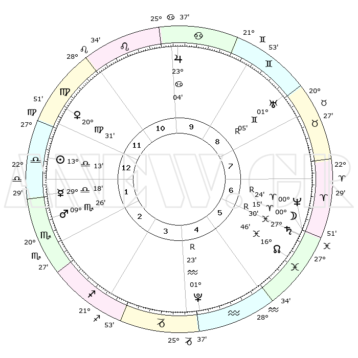 | ΘΕΣΕΙΣ ΠΛΑΝΗΤΩΝ ΑΣΤΡΟΛΟΓΙΚΟΥ ΧΑΡΤΗ ΤΗΣ ΣΤΙΓΜΗΣ ΑΥΤΗΣ | | Πλανήτης | Ζώδιο | Μοίρες | Δεκαήμ. | Σε οίκο | Απόκλιση | | Ακμές των οίκων | Ηλιος | Ζυγός | 13°07' | Δεύτερο | 1 | 05 S 11 | | 1ος | 24°04' | Παρθένος | Σελήνη | Ιχθείς | 28°51' | Τρίτο | 7 | 00 N 26 | | 2ος | 20°12' | Ζυγός | Ερμής | Ζυγός | 29°09' | Τρίτο | 2 | 11 S 50 | | 3ος | 20°24' | Σκορπιός | Αφροδίτη | Παρθένος | 20°24' | Τρίτο | 12 | 05 N 05 | | 4ος | 23°20' | Τοξότης | Αρης | Σκορπιός | 09°23' | Πρώτο | 2 | 14 S 44 | | 5ος | 26°25' | Αιγόκερως | Δίας | Καρκίνος | 23°04' | Τρίτο | 10 | 21 N 30 | | 6ος | 27°04' | Υδροχόος | Κρόνος | Ιχθείς | 27°30'R | Τρίτο | 7 | 03 S 18 | | 7ος | 24°04' | Ιχθείς | Ουρανός | Δίδυμοι | 01°06'R | Πρώτο | 9 | 20 N 10 | | 8ος | 20°12' | Κριός | Ποσειδώνας | Κριός | 00°24'R | Πρώτο | 7 | 01 S 06 | | 9ος | 20°24' | Ταύρος | Πλούτωνας | Υδροχόος | 01°23'R | Πρώτο | 5 | 23 S 32 | | 10ος | 23°20' | Δίδυμοι | Β. Δεσμός | Ιχθείς | 16°46' | Δεύτερο | 6 | 05 S 13 | | 11ος | 26°25' | Καρκίνος | Ωροσκόπος | Παρθένος | 24°04' | Τρίτο | | | 12ος | 27°04' | Λέων | Μεσουράνημα | Δίδυμοι | 23°20' | Τρίτο | | | |