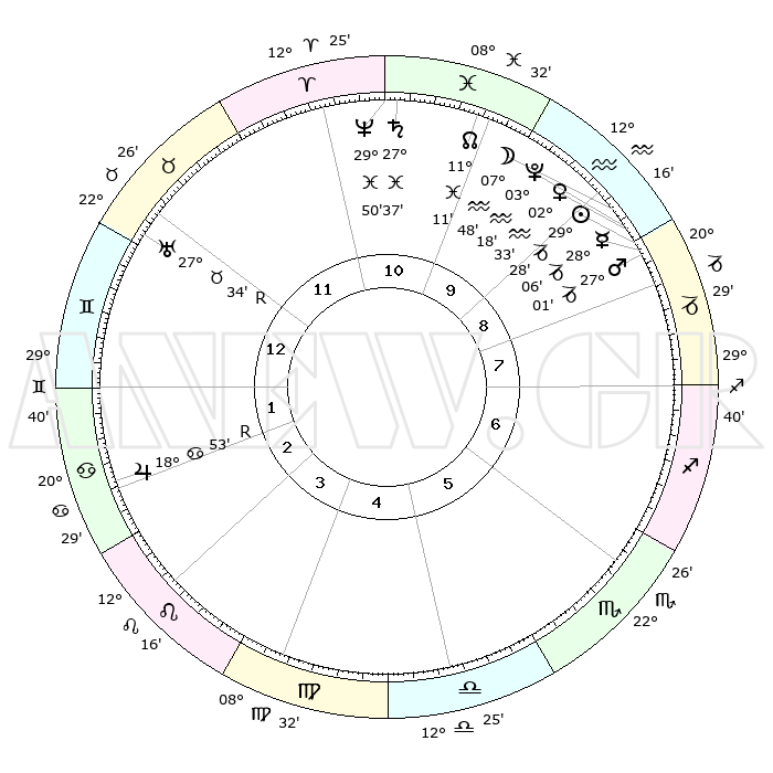 | | ΘΕΣΕΙΣ ΠΛΑΝΗΤΩΝ ΑΣΤΡΟΛΟΓΙΚΟΥ ΧΑΡΤΗ ΤΗΣ ΣΤΙΓΜΗΣ ΑΥΤΗΣ | | | | Πλανήτης | Ζώδιο | Μοίρες | Δεκαήμ. | Σε οίκο | Απόκλιση | | Ακμές των οίκων | | Ηλιος | Αιγόκερως | 29°24' | Τρίτο | 9 | 20 S 16 | | 1ος | 05°05' | Δίδυμοι | | Σελήνη | Υδροχόος | 06°56' | Πρώτο | 9 | 21 S 13 | | 2ος | 28°55' | Δίδυμοι | | Ερμής | Αιγόκερως | 27°59' | Τρίτο | 9 | 22 S 31 | | 3ος | 20°12' | Καρκίνος | | Αφροδίτη | Υδροχόος | 02°28' | Πρώτο | 9 | 20 S 41 | | 4ος | 13°22' | Λέων | | Αρης | Αιγόκερως | 26°58' | Τρίτο | 9 | 21 S 44 | | 5ος | 12°44' | Παρθένος | | Δίας | Καρκίνος | 18°53'R | Δεύτερο | 2 | 22 N 23 | | 6ος | 21°55' | Ζυγός | | Κρόνος | Ιχθείς | 27°37' | Τρίτο | 11 | 02 S 58 | | 7ος | 05°05' | Τοξότης | | Ουρανός | Ταύρος | 27°34'R | Τρίτο | 12 | 19 N 25 | | 8ος | 28°55' | Τοξότης | | Ποσειδώνας | Ιχθείς | 29°50' | Τρίτο | 11 | 01 S 17 | | 9ος | 20°12' | Αιγόκερως | | Πλούτωνας | Υδροχόος | 03°18' | Πρώτο | 9 | 23 S 06 | | 10ος | 13°22' | Υδροχόος | | Β. Δεσμός | Ιχθείς | 11°11' | Δεύτερο | 10 | 07 S 22 | | 11ος | 12°44' | Ιχθείς | | Ωροσκόπος | Δίδυμοι | 05°05' | Πρώτο | | | 12ος | 21°55' | Κριός | | Μεσουράνημα | Υδροχόος | 13°22' | Δεύτερο | | | |