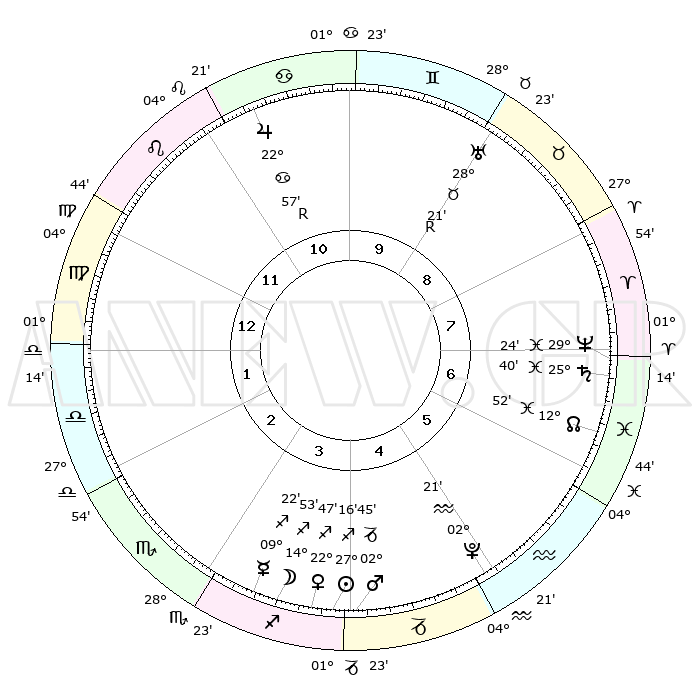 | | ΘΕΣΕΙΣ ΠΛΑΝΗΤΩΝ ΑΣΤΡΟΛΟΓΙΚΟΥ ΧΑΡΤΗ ΤΗΣ ΣΤΙΓΜΗΣ ΑΥΤΗΣ | | | | Πλανήτης | Ζώδιο | Μοίρες | Δεκαήμ. | Σε οίκο | Απόκλιση | | Ακμές των οίκων | | Ηλιος | Τοξότης | 26°51' | Τρίτο | 8 | 23 S 24 | | 1ος | 15°47' | Ταύρος | | Σελήνη | Τοξότης | 09°53' | Πρώτο | 7 | 26 S 52 | | 2ος | 13°49' | Δίδυμοι | | Ερμής | Τοξότης | 08°46' | Πρώτο | 7 | 20 S 41 | | 3ος | 06°00' | Καρκίνος | | Αφροδίτη | Τοξότης | 22°16' | Τρίτο | 8 | 23 S 11 | | 4ος | 27°60' | Καρκίνος | | Αρης | Αιγόκερως | 02°26' | Πρώτο | 8 | 24 S 13 | | 5ος | 24°15' | Λέων | | Δίας | Καρκίνος | 22°59'R | Τρίτο | 3 | 21 N 41 | | 6ος | 00°08' | Ζυγός | | Κρόνος | Ιχθείς | 25°39' | Τρίτο | 11 | 03 S 51 | | 7ος | 15°47' | Σκορπιός | | Ουρανός | Ταύρος | 28°22'R | Τρίτο | 1 | 19 N 36 | | 8ος | 13°49' | Τοξότης | | Ποσειδώνας | Ιχθείς | 29°24' | Τρίτο | 11 | 01 S 28 | | 9ος | 06°00' | Αιγόκερως | | Πλούτωνας | Υδροχόος | 02°20' | Πρώτο | 10 | 23 S 18 | | 10ος | 27°60' | Αιγόκερως | | Β. Δεσμός | Ιχθείς | 12°53' | Δεύτερο | 11 | 06 S 43 | | 11ος | 24°15' | Υδροχόος | | Ωροσκόπος | Ταύρος | 15°47' | Δεύτερο | | | 12ος | 00°08' | Κριός | | Μεσουράνημα | Αιγόκερως | 27°60' | Τρίτο | | | |