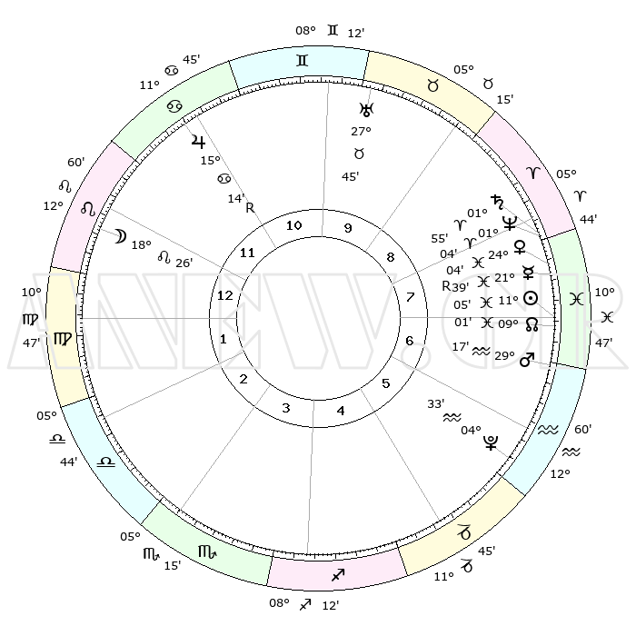 | | ΘΕΣΕΙΣ ΠΛΑΝΗΤΩΝ ΑΣΤΡΟΛΟΓΙΚΟΥ ΧΑΡΤΗ ΤΗΣ ΣΤΙΓΜΗΣ ΑΥΤΗΣ | | | | Πλανήτης | Ζώδιο | Μοίρες | Δεκαήμ. | Σε οίκο | Απόκλιση | | Ακμές των οίκων | | Ηλιος | Ιχθείς | 11°02' | Δεύτερο | 7 | 07 S 26 | | 1ος | 23°23' | Λέων | | Σελήνη | Λέων | 17°37' | Δεύτερο | 12 | 17 N 23 | | 2ος | 16°33' | Παρθένος | | Ερμής | Ιχθείς | 21°41'R | Τρίτο | 8 | 00 S 11 | | 3ος | 14°34' | Ζυγός | | Αφροδίτη | Ιχθείς | 23°60' | Τρίτο | 8 | 03 S 37 | | 4ος | 17°21' | Σκορπιός | | Αρης | Υδροχόος | 29°14' | Τρίτο | 7 | 12 S 46 | | 5ος | 22°00' | Τοξότης | | Δίας | Καρκίνος | 15°14'R | Δεύτερο | 11 | 22 N 54 | | 6ος | 24°33' | Αιγόκερως | | Κρόνος | Κριός | 01°55' | Πρώτο | 8 | 01 S 12 | | 7ος | 23°23' | Υδροχόος | | Ουρανός | Ταύρος | 27°45' | Τρίτο | 10 | 19 N 29 | | 8ος | 16°33' | Ιχθείς | | Ποσειδώνας | Κριός | 01°04' | Πρώτο | 8 | 00 S 46 | | 9ος | 14°34' | Κριός | | Πλούτωνας | Υδροχόος | 04°33' | Πρώτο | 6 | 22 S 52 | | 10ος | 17°21' | Ταύρος | | Β. Δεσμός | Ιχθείς | 09°01' | Πρώτο | 7 | 08 S 11 | | 11ος | 22°00' | Δίδυμοι | | Ωροσκόπος | Λέων | 23°23' | Τρίτο | | | 12ος | 24°33' | Καρκίνος | | Μεσουράνημα | Ταύρος | 17°21' | Δεύτερο | | | |