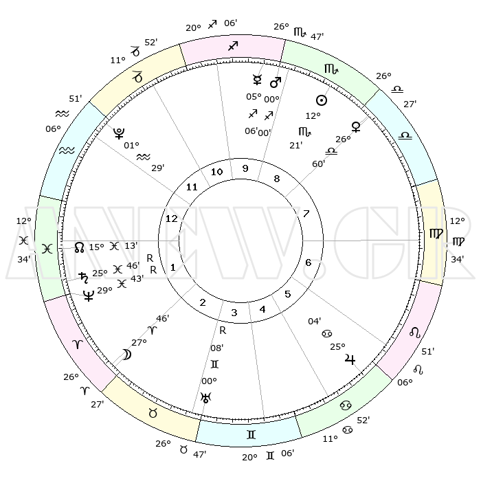 |  | ΘΕΣΕΙΣ ΠΛΑΝΗΤΩΝ ΑΣΤΡΟΛΟΓΙΚΟΥ ΧΑΡΤΗ ΤΗΣ ΣΤΙΓΜΗΣ ΑΥΤΗΣ |  |   |  | Πλανήτης | Ζώδιο | Μοίρες | Δεκαήμ. | Σε οίκο | Απόκλιση |   | Ακμές των οίκων |  | Ηλιος | Σκορπιός | 12°08' | Δεύτερο | 11 | 15 S 28 |   | 1ος | 12°22' | Τοξότης |  | Σελήνη | Κριός | 24°26' | Τρίτο | 4 | 12 N 21 |   | 2ος | 15°32' | Αιγόκερως |  | Ερμής | Τοξότης | 04°58' | Πρώτο | 12 | 23 S 55 |   | 3ος | 23°19' | Υδροχόος |  | Αφροδίτη | Ζυγός | 26°43' | Τρίτο | 10 | 08 S 58 |   | 4ος | 29°12' | Ιχθείς |  | Αρης | Σκορπιός | 29°51' | Τρίτο | 12 | 20 S 32 |   | 5ος | 28°26' | Κριός |  | Δίας | Καρκίνος | 25°04' | Τρίτο | 8 | 21 N 12 |   | 6ος | 21°53' | Ταύρος |  | Κρόνος | Ιχθείς | 25°47'R | Τρίτο | 3 | 03 S 56 |   | 7ος | 12°22' | Δίδυμοι |  | Ουρανός | Δίδυμοι | 00°09'R | Πρώτο | 6 | 19 N 58 |   | 8ος | 15°32' | Καρκίνος |  | Ποσειδώνας | Ιχθείς | 29°44'R | Τρίτο | 4 | 01 S 22 |   | 9ος | 23°19' | Λέων |  | Πλούτωνας | Υδροχόος | 01°29' | Πρώτο | 2 | 23 S 30 |   | 10ος | 29°12' | Παρθένος |  | Β. Δεσμός | Ιχθείς | 15°13' | Δεύτερο | 3 | 05 S 49 |   | 11ος | 28°26' | Ζυγός |  | Ωροσκόπος | Τοξότης | 12°22' | Δεύτερο |   |   | 12ος | 21°53' | Σκορπιός |  | Μεσουράνημα | Παρθένος | 29°12' | Τρίτο |   |   |   |