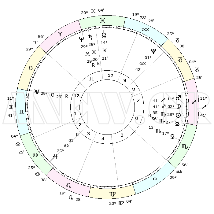 | | ΘΕΣΕΙΣ ΠΛΑΝΗΤΩΝ ΑΣΤΡΟΛΟΓΙΚΟΥ ΧΑΡΤΗ ΤΗΣ ΣΤΙΓΜΗΣ ΑΥΤΗΣ | | | | Πλανήτης | Ζώδιο | Μοίρες | Δεκαήμ. | Σε οίκο | Απόκλιση | | Ακμές των οίκων | | Ηλιος | Σκορπιός | 28°31' | Τρίτο | 7 | 19 S 49 | | 1ος | 10°59' | Ταύρος | | Σελήνη | Τοξότης | 01°51' | Πρώτο | 7 | 25 S 18 | | 2ος | 10°15' | Δίδυμοι | | Ερμής | Σκορπιός | 28°02'R | Τρίτο | 7 | 19 S 07 | | 3ος | 02°48' | Καρκίνος | | Αφροδίτη | Σκορπιός | 17°08' | Δεύτερο | 7 | 15 S 56 | | 4ος | 24°38' | Καρκίνος | | Αρης | Τοξότης | 11°38' | Δεύτερο | 8 | 22 S 45 | | 5ος | 20°16' | Λέων | | Δίας | Καρκίνος | 25°01'R | Τρίτο | 4 | 21 N 15 | | 6ος | 25°11' | Παρθένος | | Κρόνος | Ιχθείς | 25°20'R | Τρίτο | 12 | 04 S 04 | | 7ος | 10°59' | Σκορπιός | | Ουρανός | Ταύρος | 29°29'R | Τρίτο | 1 | 19 N 50 | | 8ος | 10°15' | Τοξότης | | Ποσειδώνας | Ιχθείς | 29°29'R | Τρίτο | 12 | 01 S 27 | | 9ος | 02°48' | Αιγόκερως | | Πλούτωνας | Υδροχόος | 01°42' | Πρώτο | 10 | 23 S 27 | | 10ος | 24°38' | Αιγόκερως | | Β. Δεσμός | Ιχθείς | 14°22' | Δεύτερο | 11 | 06 S 09 | | 11ος | 20°16' | Υδροχόος | | Ωροσκόπος | Ταύρος | 10°59' | Δεύτερο | | | 12ος | 25°11' | Ιχθείς | | Μεσουράνημα | Αιγόκερως | 24°38' | Τρίτο | | | |