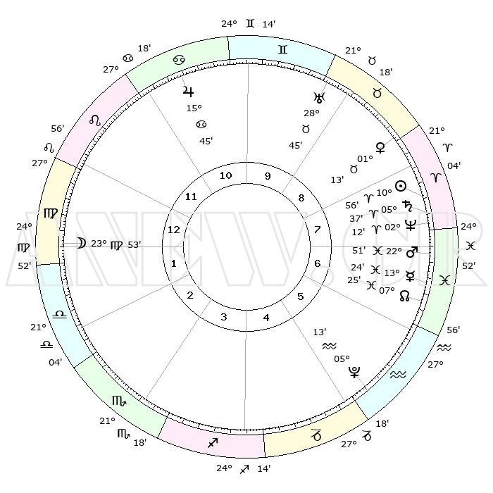| | ΘΕΣΕΙΣ ΠΛΑΝΗΤΩΝ ΑΣΤΡΟΛΟΓΙΚΟΥ ΧΑΡΤΗ ΤΗΣ ΣΤΙΓΜΗΣ ΑΥΤΗΣ | | | | Πλανήτης | Ζώδιο | Μοίρες | Δεκαήμ. | Σε οίκο | Απόκλιση | | Ακμές των οίκων | | Ηλιος | Κριός | 10°52' | Δεύτερο | 8 | 04 N 18 | | 1ος | 06°06' | Παρθένος | | Σελήνη | Παρθένος | 23°03' | Τρίτο | 1 | 01 N 34 | | 2ος | 00°36' | Ζυγός | | Ερμής | Ιχθείς | 13°21' | Δεύτερο | 7 | 07 S 41 | | 3ος | 29°46' | Ζυγός | | Αφροδίτη | Ταύρος | 01°08' | Πρώτο | 9 | 11 N 26 | | 4ος | 02°43' | Τοξότης | | Αρης | Ιχθείς | 22°48' | Τρίτο | 7 | 03 S 49 | | 5ος | 06°32' | Αιγόκερως | | Δίας | Καρκίνος | 15°45' | Δεύτερο | 11 | 22 N 52 | | 6ος | 08°03' | Υδροχόος | | Κρόνος | Κριός | 05°37' | Πρώτο | 8 | 00 N 16 | | 7ος | 06°06' | Ιχθείς | | Ουρανός | Ταύρος | 28°45' | Τρίτο | 9 | 19 N 42 | | 8ος | 00°36' | Κριός | | Ποσειδώνας | Κριός | 02°12' | Πρώτο | 8 | 00 S 20 | | 9ος | 29°46' | Κριός | | Πλούτωνας | Υδροχόος | 05°13' | Πρώτο | 5 | 22 S 47 | | 10ος | 02°43' | Δίδυμοι | | Β. Δεσμός | Ιχθείς | 07°26' | Πρώτο | 7 | 08 S 47 | | 11ος | 06°32' | Καρκίνος | | Ωροσκόπος | Παρθένος | 06°06' | Πρώτο | | | 12ος | 08°03' | Λέων | | Μεσουράνημα | Δίδυμοι | 02°43' | Πρώτο | | | |