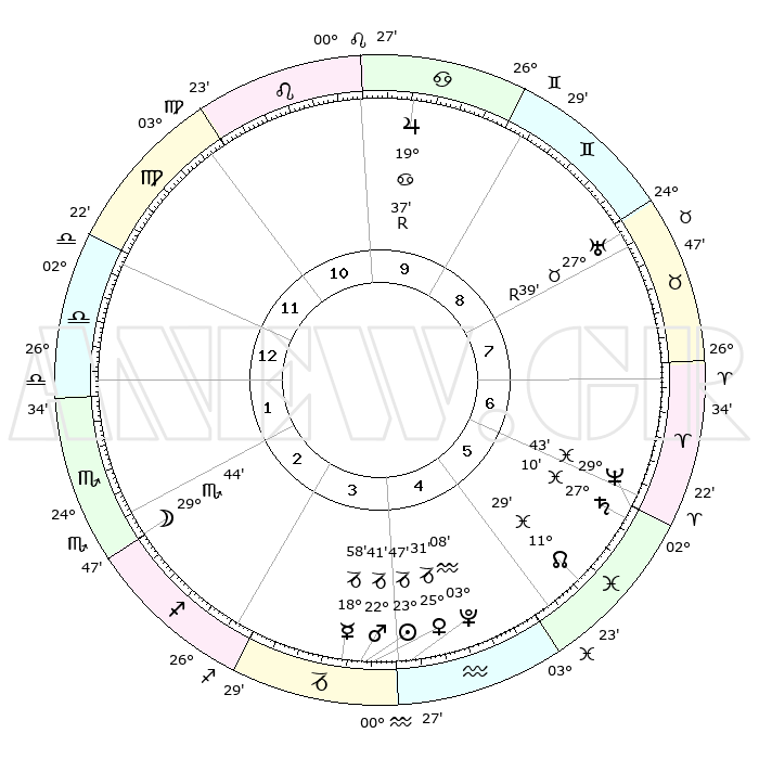 | | ΘΕΣΕΙΣ ΠΛΑΝΗΤΩΝ ΑΣΤΡΟΛΟΓΙΚΟΥ ΧΑΡΤΗ ΤΗΣ ΣΤΙΓΜΗΣ ΑΥΤΗΣ | | | | Πλανήτης | Ζώδιο | Μοίρες | Δεκαήμ. | Σε οίκο | Απόκλιση | | Ακμές των οίκων | | Ηλιος | Αιγόκερως | 23°42' | Τρίτο | 4 | 21 S 21 | | 1ος | 02°55' | Ζυγός | | Σελήνη | Σκορπιός | 28°47' | Τρίτο | 2 | 24 S 47 | | 2ος | 29°42' | Ζυγός | | Ερμής | Αιγόκερως | 18°50' | Δεύτερο | 4 | 23 S 49 | | 3ος | 00°15' | Τοξότης | | Αφροδίτη | Αιγόκερως | 25°25' | Τρίτο | 4 | 21 S 59 | | 4ος | 03°16' | Αιγόκερως | | Αρης | Αιγόκερως | 22°37' | Τρίτο | 4 | 22 S 29 | | 5ος | 06°13' | Υδροχόος | | Δίας | Καρκίνος | 19°38'R | Δεύτερο | 10 | 22 N 16 | | 6ος | 06°33' | Ιχθείς | | Κρόνος | Ιχθείς | 27°10' | Τρίτο | 6 | 03 S 10 | | 7ος | 02°55' | Κριός | | Ουρανός | Ταύρος | 27°39'R | Τρίτο | 8 | 19 N 26 | | 8ος | 29°42' | Κριός | | Ποσειδώνας | Ιχθείς | 29°43' | Τρίτο | 6 | 01 S 20 | | 9ος | 00°15' | Δίδυμοι | | Πλούτωνας | Υδροχόος | 03°07' | Πρώτο | 4 | 23 S 08 | | 10ος | 03°16' | Καρκίνος | | Β. Δεσμός | Ιχθείς | 11°29' | Δεύτερο | 6 | 07 S 15 | | 11ος | 06°13' | Λέων | | Ωροσκόπος | Ζυγός | 02°55' | Πρώτο | | | 12ος | 06°33' | Παρθένος | | Μεσουράνημα | Καρκίνος | 03°16' | Πρώτο | | | |