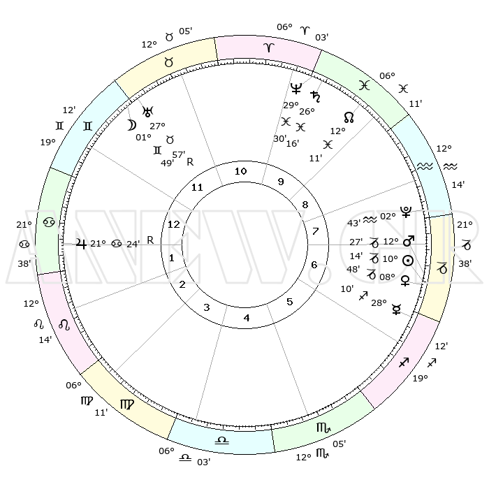 | | ΘΕΣΕΙΣ ΠΛΑΝΗΤΩΝ ΑΣΤΡΟΛΟΓΙΚΟΥ ΧΑΡΤΗ ΤΗΣ ΣΤΙΓΜΗΣ ΑΥΤΗΣ | | | | Πλανήτης | Ζώδιο | Μοίρες | Δεκαήμ. | Σε οίκο | Απόκλιση | | Ακμές των οίκων | | Ηλιος | Αιγόκερως | 10°09' | Δεύτερο | 7 | 23 S 03 | | 1ος | 26°57' | Δίδυμοι | | Σελήνη | Δίδυμοι | 00°38' | Πρώτο | 12 | 25 N 09 | | 2ος | 17°57' | Καρκίνος | | Ερμής | Τοξότης | 28°03' | Τρίτο | 7 | 23 S 57 | | 3ος | 09°34' | Λέων | | Αφροδίτη | Αιγόκερως | 08°42' | Πρώτο | 7 | 23 S 38 | | 4ος | 05°24' | Παρθένος | | Αρης | Αιγόκερως | 12°23' | Δεύτερο | 7 | 23 S 44 | | 5ος | 08°50' | Ζυγός | | Δίας | Καρκίνος | 21°24'R | Τρίτο | 2 | 21 N 58 | | 6ος | 19°01' | Σκορπιός | | Κρόνος | Ιχθείς | 26°16' | Τρίτο | 10 | 03 S 34 | | 7ος | 26°57' | Τοξότης | | Ουρανός | Ταύρος | 27°57'R | Τρίτο | 12 | 19 N 30 | | 8ος | 17°57' | Αιγόκερως | | Ποσειδώνας | Ιχθείς | 29°30' | Τρίτο | 10 | 01 S 25 | | 9ος | 09°34' | Υδροχόος | | Πλούτωνας | Υδροχόος | 02°43' | Πρώτο | 8 | 23 S 13 | | 10ος | 05°24' | Ιχθείς | | Β. Δεσμός | Ιχθείς | 12°11' | Δεύτερο | 10 | 06 S 59 | | 11ος | 08°50' | Κριός | | Ωροσκόπος | Δίδυμοι | 26°57' | Τρίτο | | | 12ος | 19°01' | Ταύρος | | Μεσουράνημα | Ιχθείς | 05°24' | Πρώτο | | | |