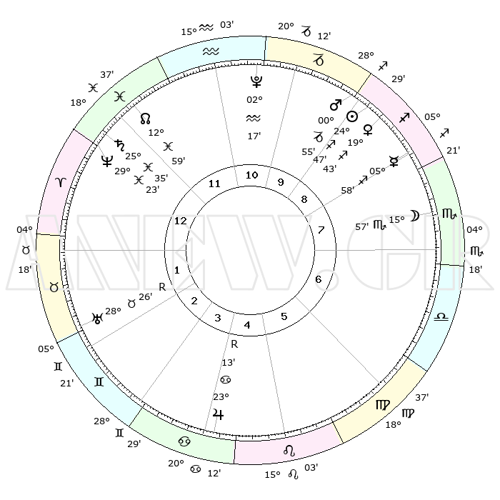 | | ΘΕΣΕΙΣ ΠΛΑΝΗΤΩΝ ΑΣΤΡΟΛΟΓΙΚΟΥ ΧΑΡΤΗ ΤΗΣ ΣΤΙΓΜΗΣ ΑΥΤΗΣ | | | | Πλανήτης | Ζώδιο | Μοίρες | Δεκαήμ. | Σε οίκο | Απόκλιση | | Ακμές των οίκων | | Ηλιος | Τοξότης | 24°28' | Τρίτο | 1 | 23 S 19 | | 1ος | 08°26' | Τοξότης | | Σελήνη | Σκορπιός | 12°06' | Δεύτερο | 11 | 19 S 34 | | 2ος | 10°53' | Αιγόκερως | | Ερμής | Τοξότης | 05°32' | Πρώτο | 12 | 19 S 51 | | 3ος | 18°00' | Υδροχόος | | Αφροδίτη | Τοξότης | 19°19' | Δεύτερο | 1 | 22 S 53 | | 4ος | 24°03' | Ιχθείς | | Αρης | Αιγόκερως | 00°40' | Πρώτο | 1 | 24 S 13 | | 5ος | 23°54' | Κριός | | Δίας | Καρκίνος | 23°15'R | Τρίτο | 8 | 21 N 38 | | 6ος | 17°50' | Ταύρος | | Κρόνος | Ιχθείς | 25°34' | Τρίτο | 4 | 03 S 53 | | 7ος | 08°26' | Δίδυμοι | | Ουρανός | Ταύρος | 28°27'R | Τρίτο | 6 | 19 N 37 | | 8ος | 10°53' | Καρκίνος | | Ποσειδώνας | Ιχθείς | 29°23' | Τρίτο | 4 | 01 S 29 | | 9ος | 18°00' | Λέων | | Πλούτωνας | Υδροχόος | 02°16' | Πρώτο | 2 | 23 S 19 | | 10ος | 24°03' | Παρθένος | | Β. Δεσμός | Ιχθείς | 13°00' | Δεύτερο | 3 | 06 S 40 | | 11ος | 23°54' | Ζυγός | | Ωροσκόπος | Τοξότης | 08°26' | Πρώτο | | | 12ος | 17°50' | Σκορπιός | | Μεσουράνημα | Παρθένος | 24°03' | Τρίτο | | | |