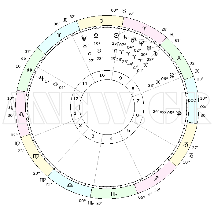 | | ΘΕΣΕΙΣ ΠΛΑΝΗΤΩΝ ΑΣΤΡΟΛΟΓΙΚΟΥ ΧΑΡΤΗ ΤΗΣ ΣΤΙΓΜΗΣ ΑΥΤΗΣ | | | | Πλανήτης | Ζώδιο | Μοίρες | Δεκαήμ. | Σε οίκο | Απόκλιση | | Ακμές των οίκων | | Ηλιος | Κριός | 25°25' | Τρίτο | 10 | 09 N 50 | | 1ος | 20°59' | Καρκίνος | | Σελήνη | Ιχθείς | 27°08' | Τρίτο | 9 | 00 N 24 | | 2ος | 11°33' | Λέων | | Ερμής | Κριός | 00°21'R | Πρώτο | 9 | 02 S 15 | | 3ος | 05°25' | Παρθένος | | Αφροδίτη | Ταύρος | 19°18' | Δεύτερο | 11 | 17 N 44 | | 4ος | 05°11' | Ζυγός | | Αρης | Κριός | 04°20' | Πρώτο | 9 | 00 N 49 | | 5ος | 11°12' | Σκορπιός | | Δίας | Καρκίνος | 17°00' | Δεύτερο | 12 | 22 N 44 | | 6ος | 18°26' | Τοξότης | | Κρόνος | Κριός | 07°26' | Πρώτο | 10 | 00 N 59 | | 7ος | 20°59' | Αιγόκερως | | Ουρανός | Ταύρος | 29°27' | Τρίτο | 11 | 19 N 52 | | 8ος | 11°33' | Υδροχόος | | Ποσειδώνας | Κριός | 02°44' | Πρώτο | 9 | 00 S 07 | | 9ος | 05°25' | Ιχθείς | | Πλούτωνας | Υδροχόος | 05°24' | Πρώτο | 7 | 22 S 47 | | 10ος | 05°11' | Κριός | | Β. Δεσμός | Ιχθείς | 06°39' | Πρώτο | 9 | 09 S 04 | | 11ος | 11°12' | Ταύρος | | Ωροσκόπος | Καρκίνος | 20°59' | Τρίτο | | | 12ος | 18°26' | Δίδυμοι | | Μεσουράνημα | Κριός | 05°11' | Πρώτο | | | |