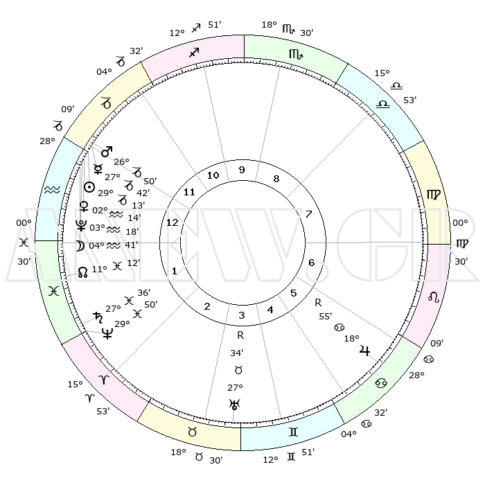 | | ΘΕΣΕΙΣ ΠΛΑΝΗΤΩΝ ΑΣΤΡΟΛΟΓΙΚΟΥ ΧΑΡΤΗ ΤΗΣ ΣΤΙΓΜΗΣ ΑΥΤΗΣ | | | | Πλανήτης | Ζώδιο | Μοίρες | Δεκαήμ. | Σε οίκο | Απόκλιση | | Ακμές των οίκων | | Ηλιος | Αιγόκερως | 29°09' | Τρίτο | 1 | 20 S 19 | | 1ος | 27°24' | Αιγόκερως | | Σελήνη | Υδροχόος | 03°49' | Πρώτο | 1 | 22 S 13 | | 2ος | 11°03' | Ιχθείς | | Ερμής | Αιγόκερως | 27°35' | Τρίτο | 1 | 22 S 35 | | 3ος | 19°53' | Κριός | | Αφροδίτη | Υδροχόος | 02°09' | Πρώτο | 1 | 20 S 45 | | 4ος | 18°48' | Ταύρος | | Αρης | Αιγόκερως | 26°47' | Τρίτο | 12 | 21 S 46 | | 5ος | 11°46' | Δίδυμοι | | Δίας | Καρκίνος | 18°55'R | Δεύτερο | 6 | 22 N 23 | | 6ος | 03°06' | Καρκίνος | | Κρόνος | Ιχθείς | 27°35' | Τρίτο | 2 | 02 S 59 | | 7ος | 27°24' | Καρκίνος | | Ουρανός | Ταύρος | 27°34'R | Τρίτο | 4 | 19 N 25 | | 8ος | 11°03' | Παρθένος | | Ποσειδώνας | Ιχθείς | 29°49' | Τρίτο | 2 | 01 S 17 | | 9ος | 19°53' | Ζυγός | | Πλούτωνας | Υδροχόος | 03°18' | Πρώτο | 1 | 23 S 06 | | 10ος | 18°48' | Σκορπιός | | Β. Δεσμός | Ιχθείς | 11°12' | Δεύτερο | 2 | 07 S 22 | | 11ος | 11°46' | Τοξότης | | Ωροσκόπος | Αιγόκερως | 27°24' | Τρίτο | | | 12ος | 03°06' | Αιγόκερως | | Μεσουράνημα | Σκορπιός | 18°48' | Δεύτερο | | | |