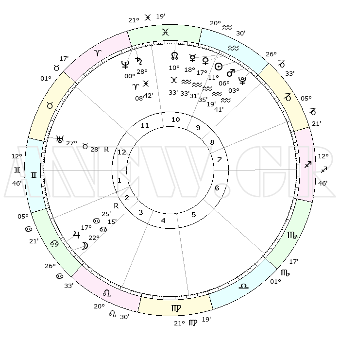 | | ΘΕΣΕΙΣ ΠΛΑΝΗΤΩΝ ΑΣΤΡΟΛΟΓΙΚΟΥ ΧΑΡΤΗ ΤΗΣ ΣΤΙΓΜΗΣ ΑΥΤΗΣ | | | | Πλανήτης | Ζώδιο | Μοίρες | Δεκαήμ. | Σε οίκο | Απόκλιση | | Ακμές των οίκων | | Ηλιος | Υδροχόος | 11°31' | Δεύτερο | 10 | 17 S 19 | | 1ος | 12°03' | Ταύρος | | Σελήνη | Καρκίνος | 21°14' | Τρίτο | 3 | 25 N 35 | | 2ος | 11°02' | Δίδυμοι | | Ερμής | Υδροχόος | 18°25' | Δεύτερο | 10 | 17 S 07 | | 3ος | 03°30' | Καρκίνος | | Αφροδίτη | Υδροχόος | 17°26' | Δεύτερο | 10 | 16 S 54 | | 4ος | 25°22' | Καρκίνος | | Αρης | Υδροχόος | 06°16' | Πρώτο | 10 | 19 S 43 | | 5ος | 21°08' | Λέων | | Δίας | Καρκίνος | 17°25'R | Δεύτερο | 3 | 22 N 36 | | 6ος | 26°16' | Παρθένος | | Κρόνος | Ιχθείς | 28°42' | Τρίτο | 12 | 02 S 31 | | 7ος | 12°03' | Σκορπιός | | Ουρανός | Ταύρος | 27°28'R | Τρίτο | 1 | 19 N 24 | | 8ος | 11°02' | Τοξότης | | Ποσειδώνας | Κριός | 00°08' | Πρώτο | 12 | 01 S 09 | | 9ος | 03°30' | Αιγόκερως | | Πλούτωνας | Υδροχόος | 03°41' | Πρώτο | 10 | 23 S 01 | | 10ος | 25°22' | Αιγόκερως | | Β. Δεσμός | Ιχθείς | 10°34' | Δεύτερο | 11 | 07 S 36 | | 11ος | 21°08' | Υδροχόος | | Ωροσκόπος | Ταύρος | 12°03' | Δεύτερο | | | 12ος | 26°16' | Ιχθείς | | Μεσουράνημα | Αιγόκερως | 25°22' | Τρίτο | | | |