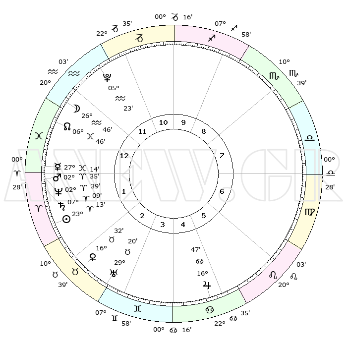 | | ΘΕΣΕΙΣ ΠΛΑΝΗΤΩΝ ΑΣΤΡΟΛΟΓΙΚΟΥ ΧΑΡΤΗ ΤΗΣ ΣΤΙΓΜΗΣ ΑΥΤΗΣ | | | | Πλανήτης | Ζώδιο | Μοίρες | Δεκαήμ. | Σε οίκο | Απόκλιση | | Ακμές των οίκων | | Ηλιος | Κριός | 23°09' | Τρίτο | 2 | 09 N 00 | | 1ος | 22°33' | Υδροχόος | | Σελήνη | Υδροχόος | 25°54' | Τρίτο | 1 | 13 S 55 | | 2ος | 08°21' | Κριός | | Ερμής | Ιχθείς | 27°09' | Τρίτο | 1 | 03 S 27 | | 3ος | 12°33' | Ταύρος | | Αφροδίτη | Ταύρος | 16°27' | Δεύτερο | 3 | 16 N 50 | | 4ος | 07°45' | Δίδυμοι | | Αρης | Κριός | 02°32' | Πρώτο | 1 | 00 N 06 | | 5ος | 29°31' | Δίδυμοι | | Δίας | Καρκίνος | 16°46' | Δεύτερο | 5 | 22 N 45 | | 6ος | 22°22' | Καρκίνος | | Κρόνος | Κριός | 07°09' | Πρώτο | 1 | 00 N 52 | | 7ος | 22°33' | Λέων | | Ουρανός | Ταύρος | 29°20' | Τρίτο | 3 | 19 N 50 | | 8ος | 08°21' | Ζυγός | | Ποσειδώνας | Κριός | 02°39' | Πρώτο | 1 | 00 S 09 | | 9ος | 12°33' | Σκορπιός | | Πλούτωνας | Υδροχόος | 05°23' | Πρώτο | 12 | 22 S 47 | | 10ος | 07°45' | Τοξότης | | Β. Δεσμός | Ιχθείς | 06°46' | Πρώτο | 1 | 09 S 02 | | 11ος | 29°31' | Τοξότης | | Ωροσκόπος | Υδροχόος | 22°33' | Τρίτο | | | 12ος | 22°22' | Αιγόκερως | | Μεσουράνημα | Τοξότης | 07°45' | Πρώτο | | | |