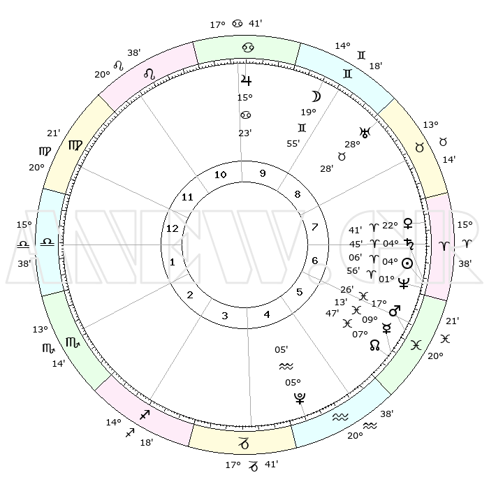 | | ΘΕΣΕΙΣ ΠΛΑΝΗΤΩΝ ΑΣΤΡΟΛΟΓΙΚΟΥ ΧΑΡΤΗ ΤΗΣ ΣΤΙΓΜΗΣ ΑΥΤΗΣ | | | | Πλανήτης | Ζώδιο | Μοίρες | Δεκαήμ. | Σε οίκο | Απόκλιση | | Ακμές των οίκων | | Ηλιος | Κριός | 04°01' | Πρώτο | 7 | 01 N 36 | | 1ος | 25°23' | Παρθένος | | Σελήνη | Δίδυμοι | 18°56' | Δεύτερο | 9 | 28 N 06 | | 2ος | 21°37' | Ζυγός | | Ερμής | Ιχθείς | 09°11' | Πρώτο | 6 | 08 S 03 | | 3ος | 21°52' | Σκορπιός | | Αφροδίτη | Κριός | 22°36' | Τρίτο | 8 | 08 N 07 | | 4ος | 24°49' | Τοξότης | | Αρης | Ιχθείς | 17°23' | Δεύτερο | 6 | 05 S 58 | | 5ος | 27°52' | Αιγόκερως | | Δίας | Καρκίνος | 15°23' | Δεύτερο | 10 | 22 N 55 | | 6ος | 28°28' | Υδροχόος | | Κρόνος | Κριός | 04°45' | Πρώτο | 7 | 00 S 04 | | 7ος | 25°23' | Ιχθείς | | Ουρανός | Ταύρος | 28°28' | Τρίτο | 9 | 19 N 39 | | 8ος | 21°37' | Κριός | | Ποσειδώνας | Κριός | 01°56' | Πρώτο | 7 | 00 S 26 | | 9ος | 21°52' | Ταύρος | | Πλούτωνας | Υδροχόος | 05°05' | Πρώτο | 5 | 22 S 48 | | 10ος | 24°49' | Δίδυμοι | | Β. Δεσμός | Ιχθείς | 07°48' | Πρώτο | 6 | 08 S 39 | | 11ος | 27°52' | Καρκίνος | | Ωροσκόπος | Παρθένος | 25°23' | Τρίτο | | | 12ος | 28°28' | Λέων | | Μεσουράνημα | Δίδυμοι | 24°49' | Τρίτο | | | |