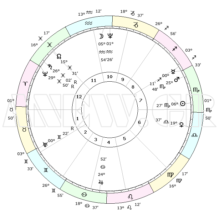 |  | ΘΕΣΕΙΣ ΠΛΑΝΗΤΩΝ ΑΣΤΡΟΛΟΓΙΚΟΥ ΧΑΡΤΗ ΤΗΣ ΣΤΙΓΜΗΣ ΑΥΤΗΣ |  |  |  | | Πλανήτης | Ζώδιο | Μοίρες | Δεκαήμ. | Σε οίκο | Απόκλιση |  | Ακμές των οίκων |  | Ηλιος | Σκορπιός | 06°01' | Πρώτο | 1 | 13 S 32 |  | 1ος | 05°18' | Σκορπιός |  | Σελήνη | Υδροχόος | 00°27' | Πρώτο | 3 | 23 S 41 |  | 2ος | 04°03' | Τοξότης |  | Ερμής | Σκορπιός | 29°45' | Τρίτο | 1 | 22 S 52 |  | 3ος | 06°28' | Αιγόκερως |  | Αφροδίτη | Ζυγός | 19°05' | Δεύτερο | 12 | 06 S 05 |  | 4ος | 11°02' | Υδροχόος |  | Αρης | Σκορπιός | 25°29' | Τρίτο | 1 | 19 S 29 |  | 5ος | 13°51' | Ιχθείς |  | Δίας | Καρκίνος | 24°51' | Τρίτο | 9 | 21 N 14 |  | 6ος | 12°01' | Κριός |  | Κρόνος | Ιχθείς | 26°03'R | Τρίτο | 5 | 03 S 50 |  | 7ος | 05°18' | Ταύρος |  | Ουρανός | Δίδυμοι | 00°23'R | Πρώτο | 7 | 20 N 01 |  | 8ος | 04°03' | Δίδυμοι |  | Ποσειδώνας | Ιχθείς | 29°51'R | Τρίτο | 5 | 01 S 19 |  | 9ος | 06°28' | Καρκίνος |  | Πλούτωνας | Υδροχόος | 01°25' | Πρώτο | 3 | 23 S 31 |  | 10ος | 11°02' | Λέων |  | Β. Δεσμός | Ιχθείς | 15°33' | Δεύτερο | 5 | 05 S 42 |  | 11ος | 13°51' | Παρθένος |  | Ωροσκόπος | Σκορπιός | 05°18' | Πρώτο |  |  | 12ος | 12°01' | Ζυγός |  | Μεσουράνημα | Λέων | 11°02' | Δεύτερο |  |  |  |