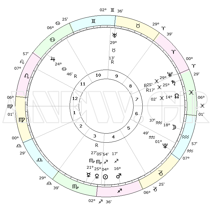 | | ΘΕΣΕΙΣ ΠΛΑΝΗΤΩΝ ΑΣΤΡΟΛΟΓΙΚΟΥ ΧΑΡΤΗ ΤΗΣ ΣΤΙΓΜΗΣ ΑΥΤΗΣ | | | | Πλανήτης | Ζώδιο | Μοίρες | Δεκαήμ. | Σε οίκο | Απόκλιση | | Ακμές των οίκων | | Ηλιος | Τοξότης | 04°53' | Πρώτο | 4 | 21 S 06 | | 1ος | 28°43' | Λέων | | Σελήνη | Υδροχόος | 18°18' | Δεύτερο | 6 | 17 S 27 | | 2ος | 22°27' | Παρθένος | | Ερμής | Σκορπιός | 21°28'R | Τρίτο | 3 | 15 S 58 | | 3ος | 20°60' | Ζυγός | | Αφροδίτη | Σκορπιός | 25°03' | Τρίτο | 4 | 18 S 12 | | 4ος | 23°54' | Σκορπιός | | Αρης | Τοξότης | 16°16' | Δεύτερο | 4 | 23 S 21 | | 5ος | 28°11' | Τοξότης | | Δίας | Καρκίνος | 24°46'R | Τρίτο | 11 | 21 N 19 | | 6ος | 00°14' | Υδροχόος | | Κρόνος | Ιχθείς | 25°17'R | Τρίτο | 8 | 04 S 04 | | 7ος | 28°43' | Υδροχόος | | Ουρανός | Ταύρος | 29°13'R | Τρίτο | 10 | 19 N 47 | | 8ος | 22°27' | Ιχθείς | | Ποσειδώνας | Ιχθείς | 29°25'R | Τρίτο | 8 | 01 S 28 | | 9ος | 20°60' | Κριός | | Πλούτωνας | Υδροχόος | 01°49' | Πρώτο | 6 | 23 S 25 | | 10ος | 23°54' | Ταύρος | | Β. Δεσμός | Ιχθείς | 14°02' | Δεύτερο | 7 | 06 S 17 | | 11ος | 28°10' | Δίδυμοι | | Ωροσκόπος | Λέων | 28°43' | Τρίτο | | | 12ος | 00°14' | Λέων | | Μεσουράνημα | Ταύρος | 23°54' | Τρίτο | | | |
