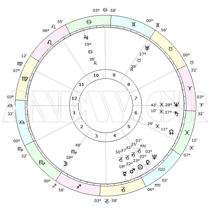 | | ΘΕΣΕΙΣ ΠΛΑΝΗΤΩΝ ΑΣΤΡΟΛΟΓΙΚΟΥ ΧΑΡΤΗ ΤΗΣ ΣΤΙΓΜΗΣ ΑΥΤΗΣ | | | | Πλανήτης | Ζώδιο | Μοίρες | Δεκαήμ. | Σε οίκο | Απόκλιση | | Ακμές των οίκων | | Ηλιος | Αιγόκερως | 23°37' | Τρίτο | 5 | 21 S 22 | | 1ος | 10°38' | Παρθένος | | Σελήνη | Σκορπιός | 27°53' | Τρίτο | 3 | 24 S 33 | | 2ος | 05°34' | Ζυγός | | Ερμής | Αιγόκερως | 18°43' | Δεύτερο | 5 | 23 S 49 | | 3ος | 05°03' | Σκορπιός | | Αφροδίτη | Αιγόκερως | 25°19' | Τρίτο | 5 | 22 S 00 | | 4ος | 08°00' | Τοξότης | | Αρης | Αιγόκερως | 22°34' | Τρίτο | 5 | 22 S 30 | | 5ος | 11°34' | Αιγόκερως | | Δίας | Καρκίνος | 19°38'R | Δεύτερο | 11 | 22 N 16 | | 6ος | 12°50' | Υδροχόος | | Κρόνος | Ιχθείς | 27°09' | Τρίτο | 7 | 03 S 10 | | 7ος | 10°38' | Ιχθείς | | Ουρανός | Ταύρος | 27°39'R | Τρίτο | 9 | 19 N 27 | | 8ος | 05°34' | Κριός | | Ποσειδώνας | Ιχθείς | 29°43' | Τρίτο | 7 | 01 S 20 | | 9ος | 05°03' | Ταύρος | | Πλούτωνας | Υδροχόος | 03°07' | Πρώτο | 5 | 23 S 08 | | 10ος | 08°00' | Δίδυμοι | | Β. Δεσμός | Ιχθείς | 11°29' | Δεύτερο | 7 | 07 S 15 | | 11ος | 11°34' | Καρκίνος | | Ωροσκόπος | Παρθένος | 10°38' | Δεύτερο | | | 12ος | 12°50' | Λέων | | Μεσουράνημα | Δίδυμοι | 08°00' | Πρώτο | | | |