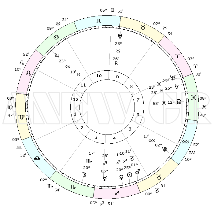 | | ΘΕΣΕΙΣ ΠΛΑΝΗΤΩΝ ΑΣΤΡΟΛΟΓΙΚΟΥ ΧΑΡΤΗ ΤΗΣ ΣΤΙΓΜΗΣ ΑΥΤΗΣ | | | | Πλανήτης | Ζώδιο | Μοίρες | Δεκαήμ. | Σε οίκο | Απόκλιση | | Ακμές των οίκων | | Ηλιος | Τοξότης | 24°49' | Τρίτο | 8 | 23 S 20 | | 1ος | 18°09' | Ταύρος | | Σελήνη | Σκορπιός | 16°17' | Δεύτερο | 6 | 21 S 00 | | 2ος | 15°36' | Δίδυμοι | | Ερμής | Τοξότης | 06°01' | Πρώτο | 7 | 19 S 59 | | 3ος | 07°38' | Καρκίνος | | Αφροδίτη | Τοξότης | 19°45' | Δεύτερο | 8 | 22 S 56 | | 4ος | 29°43' | Καρκίνος | | Αρης | Αιγόκερως | 00°56' | Πρώτο | 8 | 24 S 13 | | 5ος | 26°18' | Λέων | | Δίας | Καρκίνος | 23°12'R | Τρίτο | 3 | 21 N 38 | | 6ος | 02°38' | Ζυγός | | Κρόνος | Ιχθείς | 25°35' | Τρίτο | 11 | 03 S 53 | | 7ος | 18°09' | Σκορπιός | | Ουρανός | Ταύρος | 28°26'R | Τρίτο | 1 | 19 N 37 | | 8ος | 15°36' | Τοξότης | | Ποσειδώνας | Ιχθείς | 29°23' | Τρίτο | 11 | 01 S 29 | | 9ος | 07°38' | Αιγόκερως | | Πλούτωνας | Υδροχόος | 02°17' | Πρώτο | 10 | 23 S 19 | | 10ος | 29°43' | Αιγόκερως | | Β. Δεσμός | Ιχθείς | 12°59' | Δεύτερο | 11 | 06 S 41 | | 11ος | 26°18' | Υδροχόος | | Ωροσκόπος | Ταύρος | 18°09' | Δεύτερο | | | 12ος | 02°38' | Κριός | | Μεσουράνημα | Αιγόκερως | 29°43' | Τρίτο | | | |