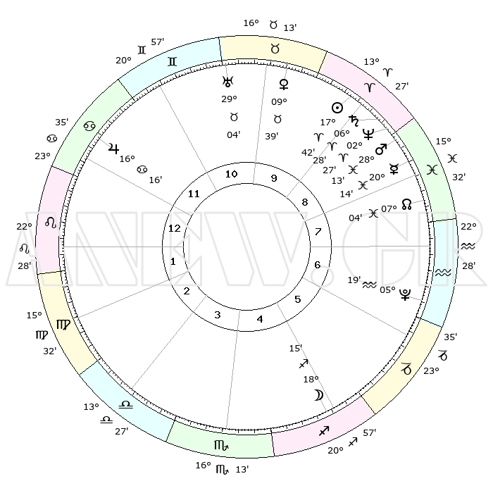 | | ΘΕΣΕΙΣ ΠΛΑΝΗΤΩΝ ΑΣΤΡΟΛΟΓΙΚΟΥ ΧΑΡΤΗ ΤΗΣ ΣΤΙΓΜΗΣ ΑΥΤΗΣ | | | | Πλανήτης | Ζώδιο | Μοίρες | Δεκαήμ. | Σε οίκο | Απόκλιση | | Ακμές των οίκων | | Ηλιος | Κριός | 17°38' | Δεύτερο | 9 | 06 N 55 | | 1ος | 02°33' | Λέων | | Σελήνη | Τοξότης | 17°26' | Δεύτερο | 5 | 27 S 55 | | 2ος | 23°46' | Λέων | | Ερμής | Ιχθείς | 20°09' | Τρίτο | 9 | 05 S 51 | | 3ος | 19°09' | Παρθένος | | Αφροδίτη | Ταύρος | 09°34' | Πρώτο | 10 | 14 N 31 | | 4ος | 20°30' | Ζυγός | | Αρης | Ιχθείς | 28°10' | Τρίτο | 9 | 01 S 40 | | 5ος | 26°28' | Σκορπιός | | Δίας | Καρκίνος | 16°16' | Δεύτερο | 12 | 22 N 49 | | 6ος | 01°45' | Αιγόκερως | | Κρόνος | Κριός | 06°28' | Πρώτο | 9 | 00 N 36 | | 7ος | 02°33' | Υδροχόος | | Ουρανός | Ταύρος | 29°03' | Τρίτο | 11 | 19 N 47 | | 8ος | 23°46' | Υδροχόος | | Ποσειδώνας | Κριός | 02°27' | Πρώτο | 9 | 00 S 14 | | 9ος | 19°09' | Ιχθείς | | Πλούτωνας | Υδροχόος | 05°19' | Πρώτο | 7 | 22 S 47 | | 10ος | 20°30' | Κριός | | Β. Δεσμός | Ιχθείς | 07°04' | Πρώτο | 8 | 08 S 55 | | 11ος | 26°28' | Ταύρος | | Ωροσκόπος | Λέων | 02°33' | Πρώτο | | | 12ος | 01°45' | Καρκίνος | | Μεσουράνημα | Κριός | 20°30' | Τρίτο | | | |