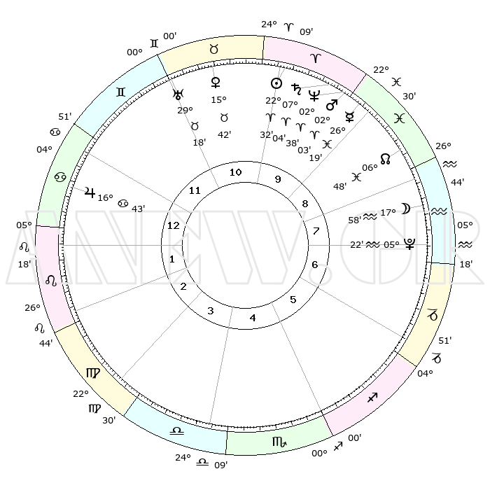 | | ΘΕΣΕΙΣ ΠΛΑΝΗΤΩΝ ΑΣΤΡΟΛΟΓΙΚΟΥ ΧΑΡΤΗ ΤΗΣ ΣΤΙΓΜΗΣ ΑΥΤΗΣ | | | | Πλανήτης | Ζώδιο | Μοίρες | Δεκαήμ. | Σε οίκο | Απόκλιση | | Ακμές των οίκων | | Ηλιος | Κριός | 22°28' | Τρίτο | 10 | 08 N 45 | | 1ος | 15°47' | Καρκίνος | | Σελήνη | Υδροχόος | 17°08' | Δεύτερο | 8 | 17 S 28 | | 2ος | 06°14' | Λέων | | Ερμής | Ιχθείς | 26°14' | Τρίτο | 9 | 03 S 47 | | 3ος | 29°28' | Λέων | | Αφροδίτη | Ταύρος | 15°37' | Δεύτερο | 11 | 16 N 34 | | 4ος | 28°25' | Παρθένος | | Αρης | Κριός | 01°60' | Πρώτο | 10 | 00 S 07 | | 5ος | 04°11' | Σκορπιός | | Δίας | Καρκίνος | 16°42' | Δεύτερο | 1 | 22 N 46 | | 6ος | 12°16' | Τοξότης | | Κρόνος | Κριός | 07°04' | Πρώτο | 10 | 00 N 50 | | 7ος | 15°47' | Αιγόκερως | | Ουρανός | Ταύρος | 29°18' | Τρίτο | 11 | 19 N 50 | | 8ος | 06°14' | Υδροχόος | | Ποσειδώνας | Κριός | 02°38' | Πρώτο | 10 | 00 S 09 | | 9ος | 29°28' | Υδροχόος | | Πλούτωνας | Υδροχόος | 05°22' | Πρώτο | 7 | 22 S 47 | | 10ος | 28°25' | Ιχθείς | | Β. Δεσμός | Ιχθείς | 06°48' | Πρώτο | 9 | 09 S 01 | | 11ος | 04°11' | Ταύρος | | Ωροσκόπος | Καρκίνος | 15°47' | Δεύτερο | | | 12ος | 12°16' | Δίδυμοι | | Μεσουράνημα | Ιχθείς | 28°25' | Τρίτο | | | |