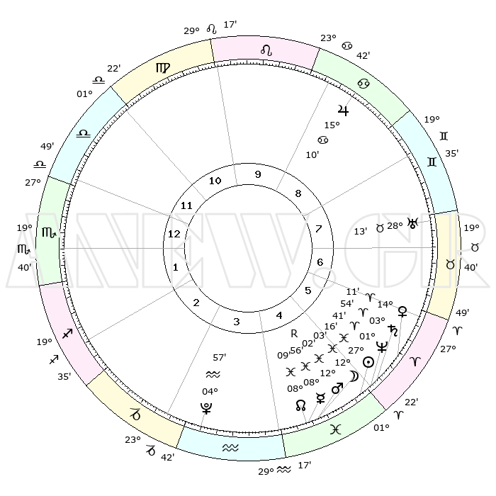 | | ΘΕΣΕΙΣ ΠΛΑΝΗΤΩΝ ΑΣΤΡΟΛΟΓΙΚΟΥ ΧΑΡΤΗ ΤΗΣ ΣΤΙΓΜΗΣ ΑΥΤΗΣ | | | | Πλανήτης | Ζώδιο | Μοίρες | Δεκαήμ. | Σε οίκο | Απόκλιση | | Ακμές των οίκων | | Ηλιος | Ιχθείς | 27°13' | Τρίτο | 5 | 01 S 07 | | 1ος | 00°58' | Σκορπιός | | Σελήνη | Ιχθείς | 11°11' | Δεύτερο | 5 | 07 S 11 | | 2ος | 29°26' | Σκορπιός | | Ερμής | Ιχθείς | 08°57'R | Πρώτο | 5 | 06 S 36 | | 3ος | 01°28' | Αιγόκερως | | Αφροδίτη | Κριός | 14°07' | Δεύτερο | 6 | 04 N 41 | | 4ος | 05°43' | Υδροχόος | | Αρης | Ιχθείς | 11°59' | Δεύτερο | 5 | 08 S 04 | | 5ος | 08°37' | Ιχθείς | | Δίας | Καρκίνος | 15°09' | Δεύτερο | 9 | 22 N 56 | | 6ος | 07°12' | Κριός | | Κρόνος | Κριός | 03°53' | Πρώτο | 5 | 00 S 24 | | 7ος | 00°58' | Ταύρος | | Ουρανός | Ταύρος | 28°12' | Τρίτο | 7 | 19 N 35 | | 8ος | 29°26' | Ταύρος | | Ποσειδώνας | Κριός | 01°40' | Πρώτο | 5 | 00 S 32 | | 9ος | 01°28' | Καρκίνος | | Πλούτωνας | Υδροχόος | 04°57' | Πρώτο | 3 | 22 S 49 | | 10ος | 05°43' | Λέων | | Β. Δεσμός | Ιχθείς | 08°09' | Πρώτο | 4 | 08 S 31 | | 11ος | 08°37' | Παρθένος | | Ωροσκόπος | Σκορπιός | 00°58' | Πρώτο | | | 12ος | 07°12' | Ζυγός | | Μεσουράνημα | Λέων | 05°43' | Πρώτο | | | |