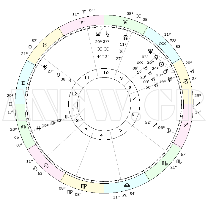 | | ΘΕΣΕΙΣ ΠΛΑΝΗΤΩΝ ΑΣΤΡΟΛΟΓΙΚΟΥ ΧΑΡΤΗ ΤΗΣ ΣΤΙΓΜΗΣ ΑΥΤΗΣ | | | | Πλανήτης | Ζώδιο | Μοίρες | Δεκαήμ. | Σε οίκο | Απόκλιση | | Ακμές των οίκων | | Ηλιος | Αιγόκερως | 24°19' | Τρίτο | 9 | 21 S 15 | | 1ος | 01°45' | Δίδυμοι | | Σελήνη | Τοξότης | 05°59' | Πρώτο | 7 | 26 S 20 | | 2ος | 26°13' | Δίδυμοι | | Ερμής | Αιγόκερως | 19°49' | Δεύτερο | 9 | 23 S 42 | | 3ος | 17°34' | Καρκίνος | | Αφροδίτη | Αιγόκερως | 26°11' | Τρίτο | 9 | 21 S 51 | | 4ος | 10°28' | Λέων | | Αρης | Αιγόκερως | 23°06' | Τρίτο | 9 | 22 S 25 | | 5ος | 09°14' | Παρθένος | | Δίας | Καρκίνος | 19°33'R | Δεύτερο | 3 | 22 N 17 | | 6ος | 17°57' | Ζυγός | | Κρόνος | Ιχθείς | 27°12' | Τρίτο | 11 | 03 S 09 | | 7ος | 01°45' | Τοξότης | | Ουρανός | Ταύρος | 27°38'R | Τρίτο | 12 | 19 N 26 | | 8ος | 26°13' | Τοξότης | | Ποσειδώνας | Ιχθείς | 29°44' | Τρίτο | 11 | 01 S 19 | | 9ος | 17°34' | Αιγόκερως | | Πλούτωνας | Υδροχόος | 03°09' | Πρώτο | 9 | 23 S 08 | | 10ος | 10°28' | Υδροχόος | | Β. Δεσμός | Ιχθείς | 11°27' | Δεύτερο | 11 | 07 S 16 | | 11ος | 09°14' | Ιχθείς | | Ωροσκόπος | Δίδυμοι | 01°45' | Πρώτο | | | 12ος | 17°57' | Κριός | | Μεσουράνημα | Υδροχόος | 10°28' | Δεύτερο | | | |