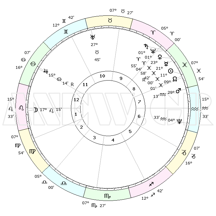 | | ΘΕΣΕΙΣ ΠΛΑΝΗΤΩΝ ΑΣΤΡΟΛΟΓΙΚΟΥ ΧΑΡΤΗ ΤΗΣ ΣΤΙΓΜΗΣ ΑΥΤΗΣ | | | | Πλανήτης | Ζώδιο | Μοίρες | Δεκαήμ. | Σε οίκο | Απόκλιση | | Ακμές των οίκων | | Ηλιος | Ιχθείς | 10°57' | Δεύτερο | 8 | 07 S 28 | | 1ος | 29°24' | Καρκίνος | | Σελήνη | Λέων | 16°29' | Δεύτερο | 1 | 17 N 49 | | 2ος | 20°24' | Λέων | | Ερμής | Ιχθείς | 21°44'R | Τρίτο | 9 | 00 S 11 | | 3ος | 15°23' | Παρθένος | | Αφροδίτη | Ιχθείς | 23°53' | Τρίτο | 9 | 03 S 40 | | 4ος | 16°20' | Ζυγός | | Αρης | Υδροχόος | 29°10' | Τρίτο | 8 | 12 S 47 | | 5ος | 22°24' | Σκορπιός | | Δίας | Καρκίνος | 15°14'R | Δεύτερο | 12 | 22 N 54 | | 6ος | 28°12' | Τοξότης | | Κρόνος | Κριός | 01°54' | Πρώτο | 9 | 01 S 12 | | 7ος | 29°24' | Αιγόκερως | | Ουρανός | Ταύρος | 27°45' | Τρίτο | 11 | 19 N 29 | | 8ος | 20°24' | Υδροχόος | | Ποσειδώνας | Κριός | 01°04' | Πρώτο | 9 | 00 S 46 | | 9ος | 15°23' | Ιχθείς | | Πλούτωνας | Υδροχόος | 04°33' | Πρώτο | 7 | 22 S 52 | | 10ος | 16°20' | Κριός | | Β. Δεσμός | Ιχθείς | 09°01' | Πρώτο | 8 | 08 S 11 | | 11ος | 22°24' | Ταύρος | | Ωροσκόπος | Καρκίνος | 29°24' | Τρίτο | | | 12ος | 28°12' | Δίδυμοι | | Μεσουράνημα | Κριός | 16°20' | Δεύτερο | | | |