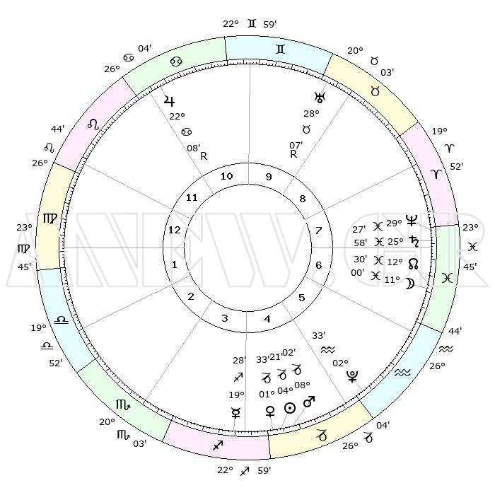 | | ΘΕΣΕΙΣ ΠΛΑΝΗΤΩΝ ΑΣΤΡΟΛΟΓΙΚΟΥ ΧΑΡΤΗ ΤΗΣ ΣΤΙΓΜΗΣ ΑΥΤΗΣ | | | | Πλανήτης | Ζώδιο | Μοίρες | Δεκαήμ. | Σε οίκο | Απόκλιση | | Ακμές των οίκων | | Ηλιος | Αιγόκερως | 04°16' | Πρώτο | 5 | 23 S 22 | | 1ος | 28°44' | Λέων | | Σελήνη | Ιχθείς | 09°54' | Πρώτο | 7 | 07 S 58 | | 2ος | 22°27' | Παρθένος | | Ερμής | Τοξότης | 19°21' | Δεύτερο | 4 | 22 S 51 | | 3ος | 21°00' | Ζυγός | | Αφροδίτη | Αιγόκερως | 01°26' | Πρώτο | 5 | 23 S 42 | | 4ος | 23°54' | Σκορπιός | | Αρης | Αιγόκερως | 07°58' | Πρώτο | 5 | 24 S 03 | | 5ος | 28°11' | Τοξότης | | Δίας | Καρκίνος | 22°08'R | Τρίτο | 11 | 21 N 50 | | 6ος | 00°14' | Υδροχόος | | Κρόνος | Ιχθείς | 25°57' | Τρίτο | 8 | 03 S 42 | | 7ος | 28°44' | Υδροχόος | | Ουρανός | Ταύρος | 28°08'R | Τρίτο | 10 | 19 N 33 | | 8ος | 22°27' | Ιχθείς | | Ποσειδώνας | Ιχθείς | 29°27' | Τρίτο | 8 | 01 S 27 | | 9ος | 21°00' | Κριός | | Πλούτωνας | Υδροχόος | 02°32' | Πρώτο | 6 | 23 S 15 | | 10ος | 23°54' | Ταύρος | | Β. Δεσμός | Ιχθείς | 12°30' | Δεύτερο | 7 | 06 S 52 | | 11ος | 28°11' | Δίδυμοι | | Ωροσκόπος | Λέων | 28°44' | Τρίτο | | | 12ος | 00°14' | Λέων | | Μεσουράνημα | Ταύρος | 23°54' | Τρίτο | | | |