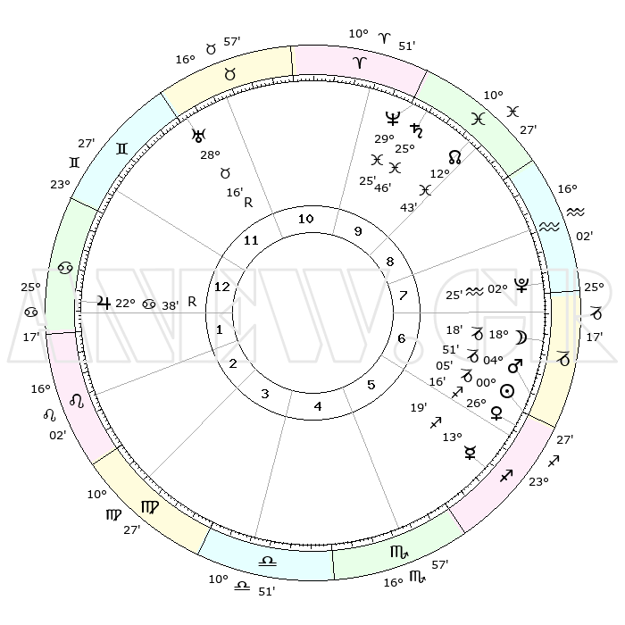 | | ΘΕΣΕΙΣ ΠΛΑΝΗΤΩΝ ΑΣΤΡΟΛΟΓΙΚΟΥ ΧΑΡΤΗ ΤΗΣ ΣΤΙΓΜΗΣ ΑΥΤΗΣ | | | | Πλανήτης | Ζώδιο | Μοίρες | Δεκαήμ. | Σε οίκο | Απόκλιση | | Ακμές των οίκων | | Ηλιος | Αιγόκερως | 00°01' | Πρώτο | 6 | 23 S 26 | | 1ος | 03°59' | Καρκίνος | | Σελήνη | Αιγόκερως | 17°27' | Δεύτερο | 7 | 26 S 20 | | 2ος | 24°34' | Καρκίνος | | Ερμής | Τοξότης | 13°13' | Δεύτερο | 6 | 21 S 42 | | 3ος | 16°40' | Λέων | | Αφροδίτη | Τοξότης | 26°11' | Τρίτο | 6 | 23 S 29 | | 4ος | 13°38' | Παρθένος | | Αρης | Αιγόκερως | 04°48' | Πρώτο | 7 | 24 S 10 | | 5ος | 18°10' | Ζυγός | | Δίας | Καρκίνος | 22°38'R | Τρίτο | 1 | 21 N 45 | | 6ος | 27°49' | Σκορπιός | | Κρόνος | Ιχθείς | 25°46' | Τρίτο | 10 | 03 S 47 | | 7ος | 03°59' | Αιγόκερως | | Ουρανός | Ταύρος | 28°16'R | Τρίτο | 12 | 19 N 34 | | 8ος | 24°34' | Αιγόκερως | | Ποσειδώνας | Ιχθείς | 29°25' | Τρίτο | 10 | 01 S 28 | | 9ος | 16°40' | Υδροχόος | | Πλούτωνας | Υδροχόος | 02°25' | Πρώτο | 8 | 23 S 17 | | 10ος | 13°38' | Ιχθείς | | Β. Δεσμός | Ιχθείς | 12°43' | Δεύτερο | 9 | 06 S 47 | | 11ος | 18°10' | Κριός | | Ωροσκόπος | Καρκίνος | 03°59' | Πρώτο | | | 12ος | 27°49' | Ταύρος | | Μεσουράνημα | Ιχθείς | 13°38' | Δεύτερο | | | |